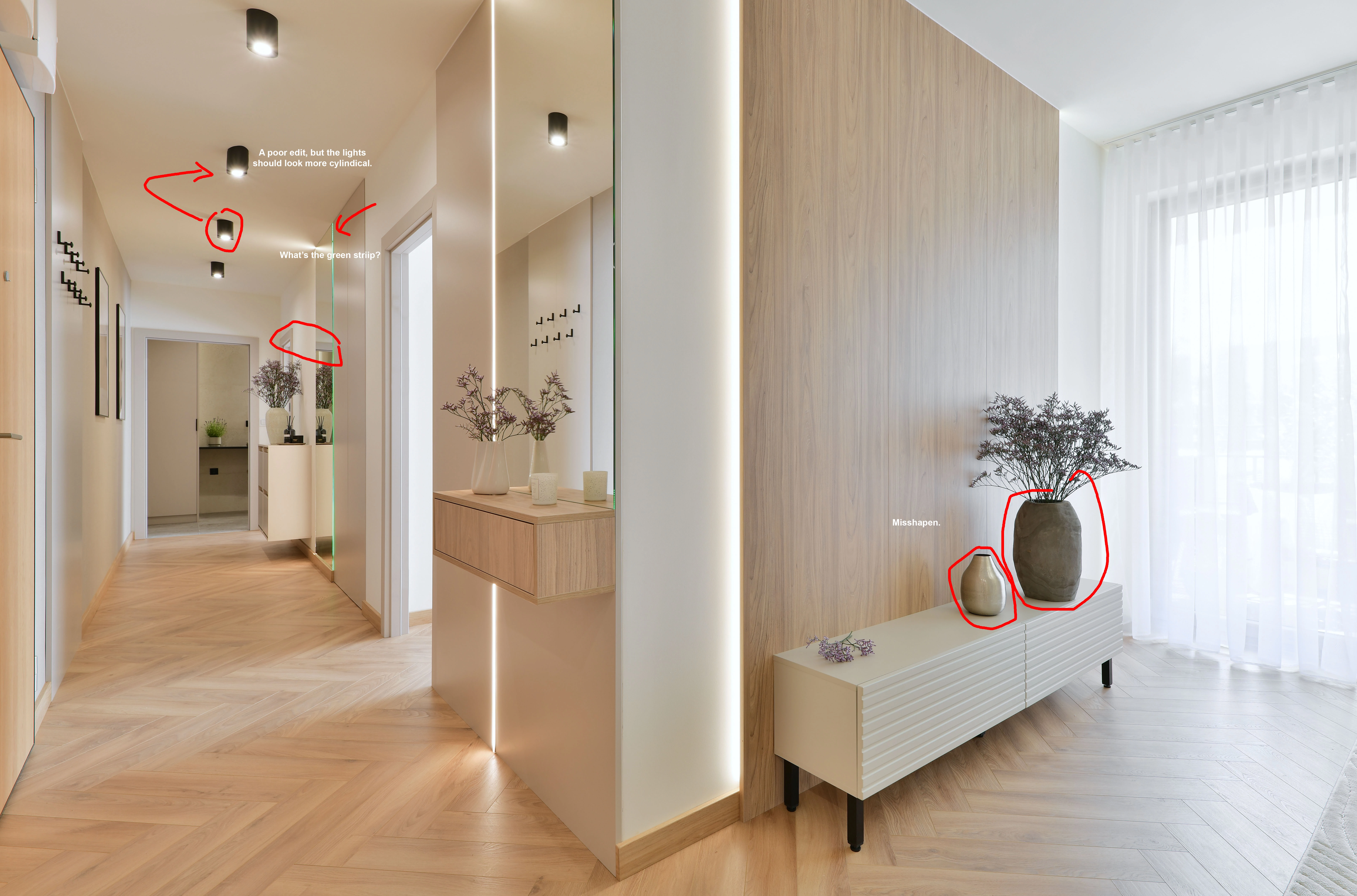 Thanks for the hints. The green strip is a led light shining through the mirror. This is a real effect. But you're right, it may be distracting, I can remove that. And I think that maybe I could crop the picture from the top to get rid of the top black cylindrical spotlight which is in fact deformed by the wide angle lens. And... To be honest, I didnt zoom the picture before I posted it, now I can see that I also have the purple fringing problem there. You think It could also be the rejection reason?