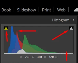 The shadow "clipping" indicator on the left side has thrown a warning that some shadows are overexposed. Not necessarily a bad thing because some details are present.
