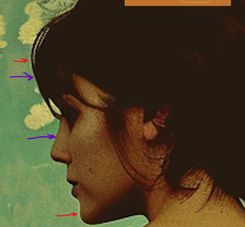 In addition to the obvious colour cast, this image has been unprofessionally upscaled. You have introduced aliasing (pink) and you have a white border around the subject (red).