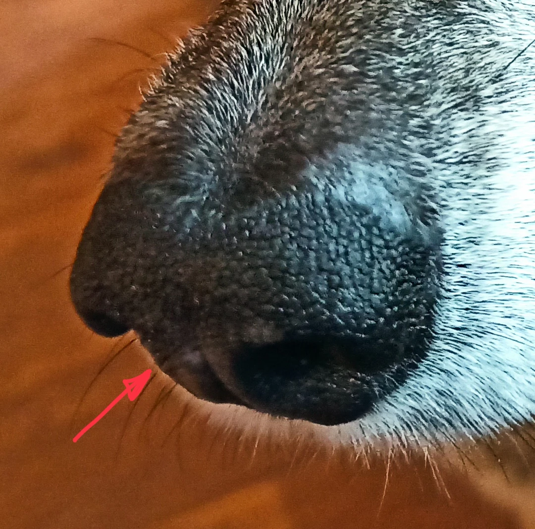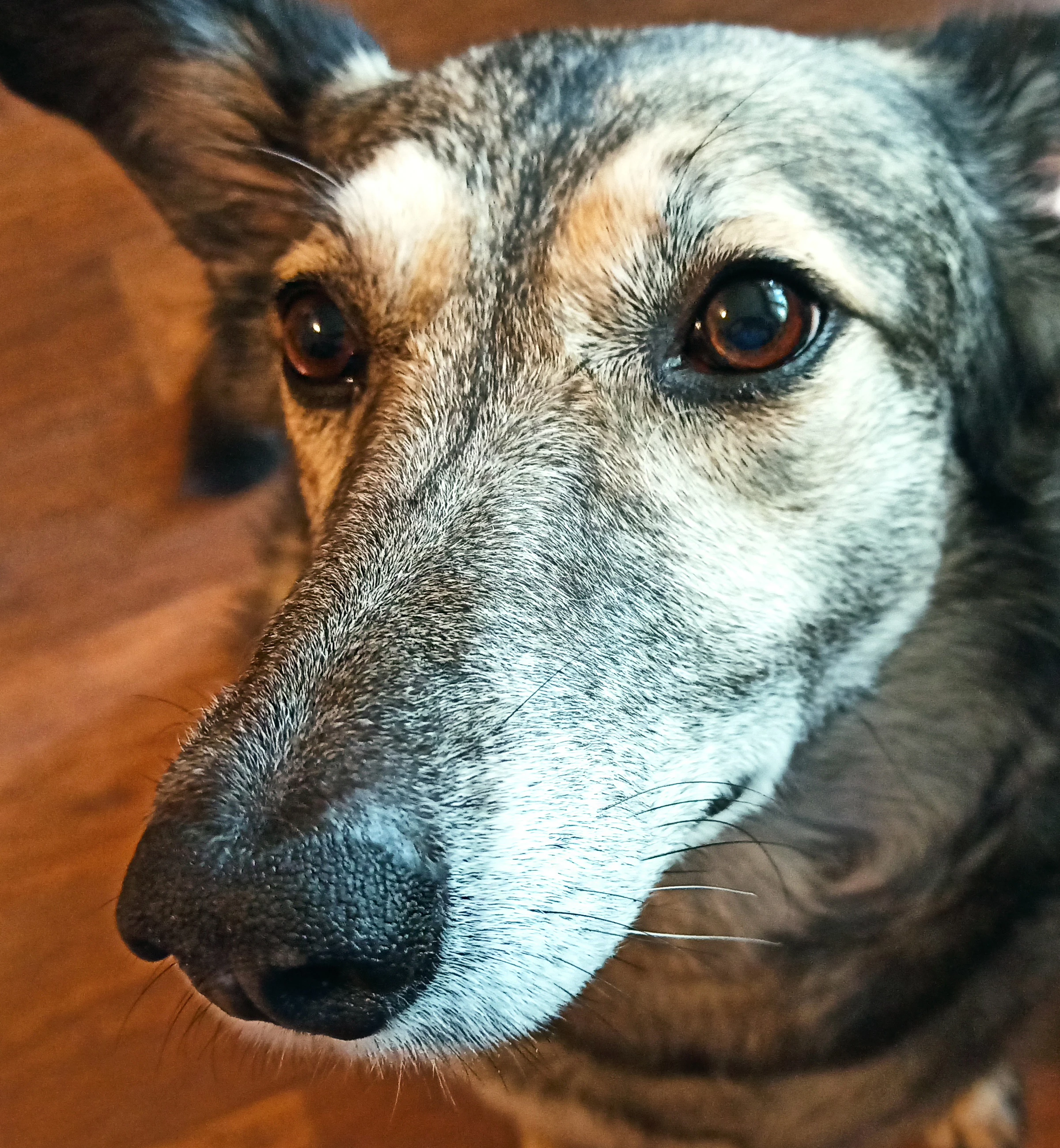 The dog does not have a sad eye, but an out of focus eye. Part of the fur is overexposed due to wrong lightning and bad editing, the background is noisy and you have a halo around the nose/mouth of the dog.