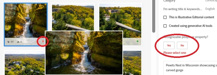 After uploading multiple photos with metadata already populated, I multiselect all images and update the "Recognizable people or property?" setting to "No" and Save. Most images stay red until you manually click on each one of them. THen after submission 90% of them will not be submitted and become red again with this setting not saved again. If you manually choose No and save each image chances are 50% after submission they will not be submitted and setting not saved again...
