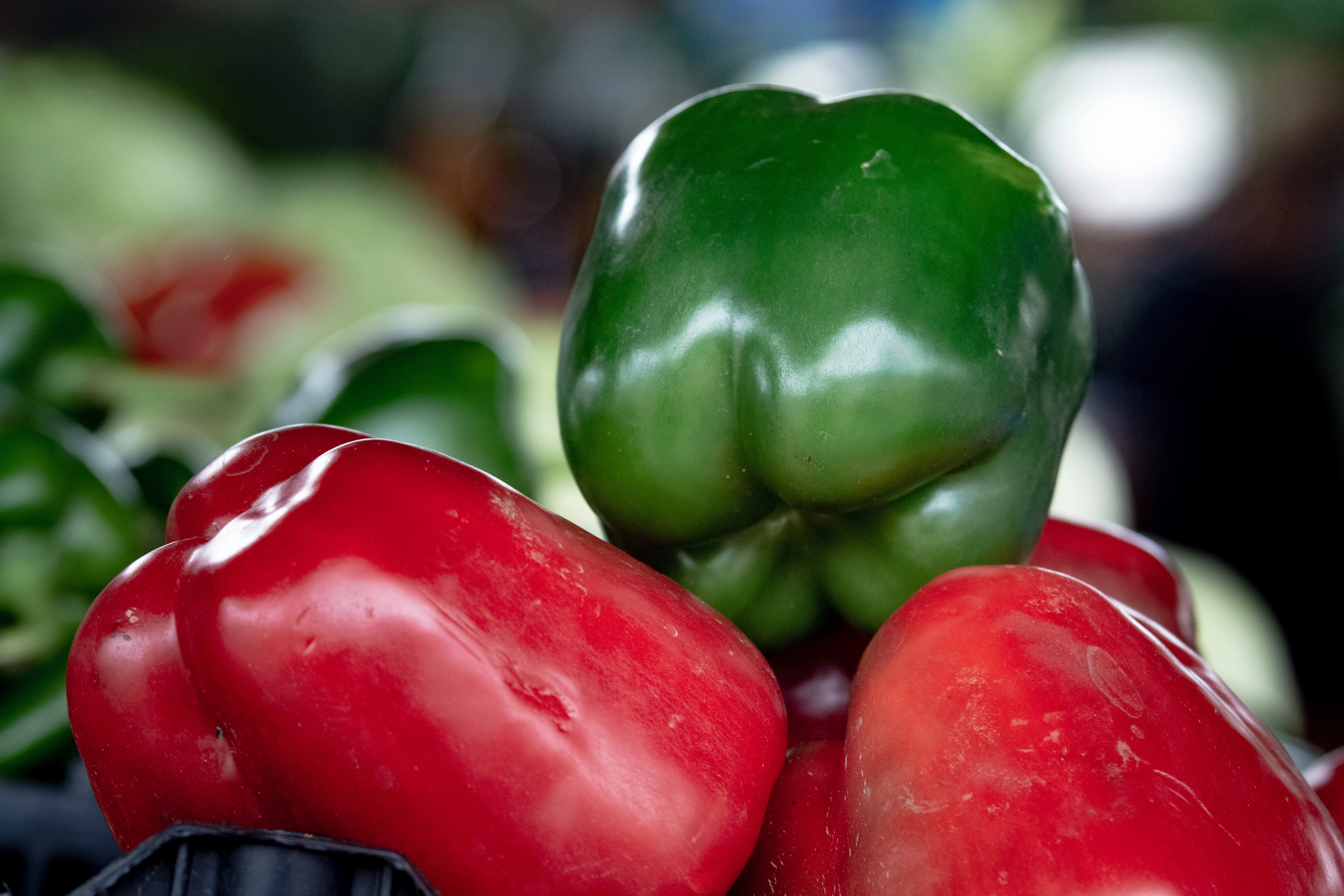 It's underexposed, the green pepper is not in sharp focus, and the red peppers aren't particularly attractive specimens as well as being too tightly cropped. If you're going to shoot a close-up of food, make sure it's well lit and near perfect, unless you're specifically aiming to represent "ugly food". Alternatively, you can spend a lot of time editing out the blemishes, which I wouldn't suggest in this case because there are already 871,000 examples of "bell peppers" in the Adobe Stock database.