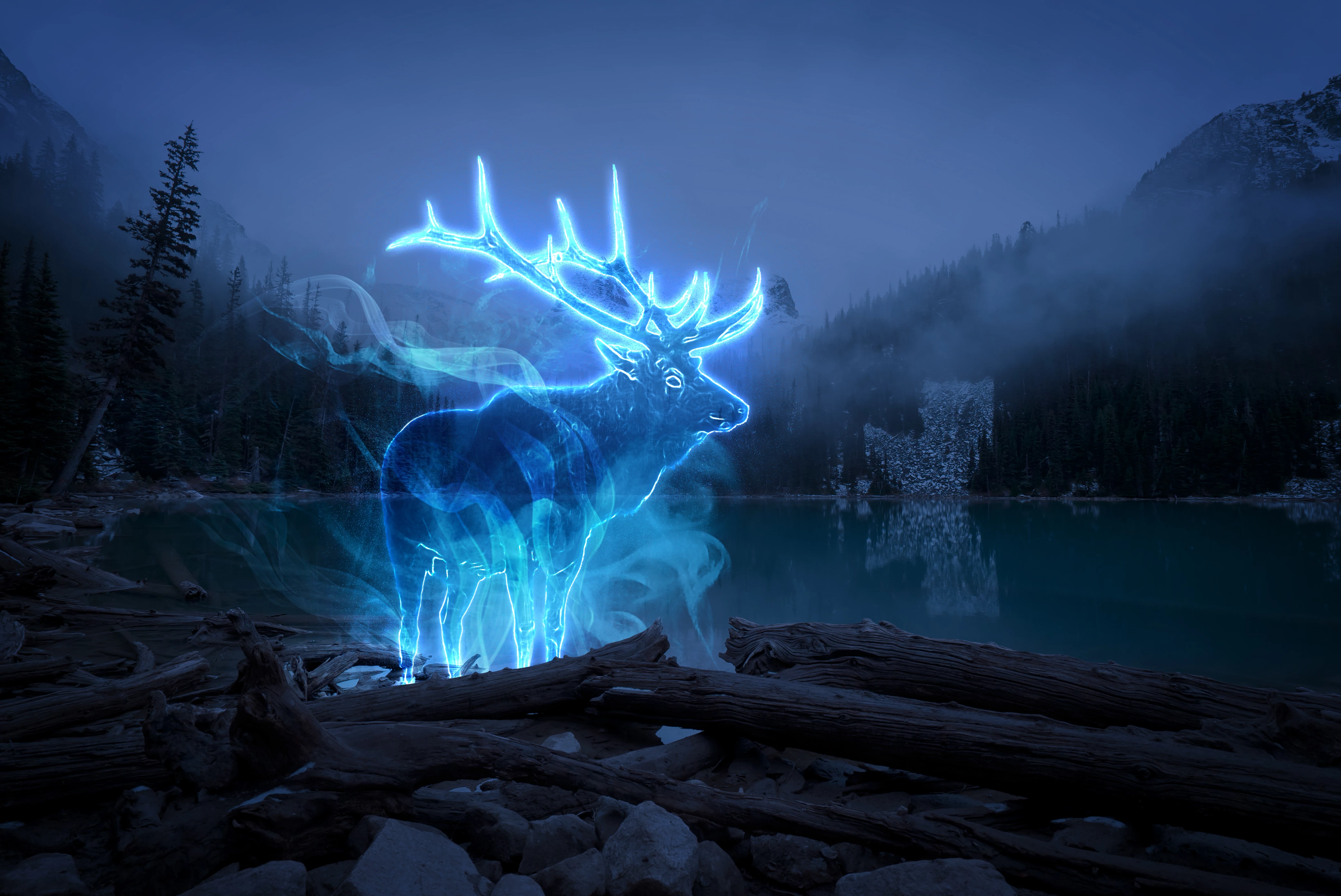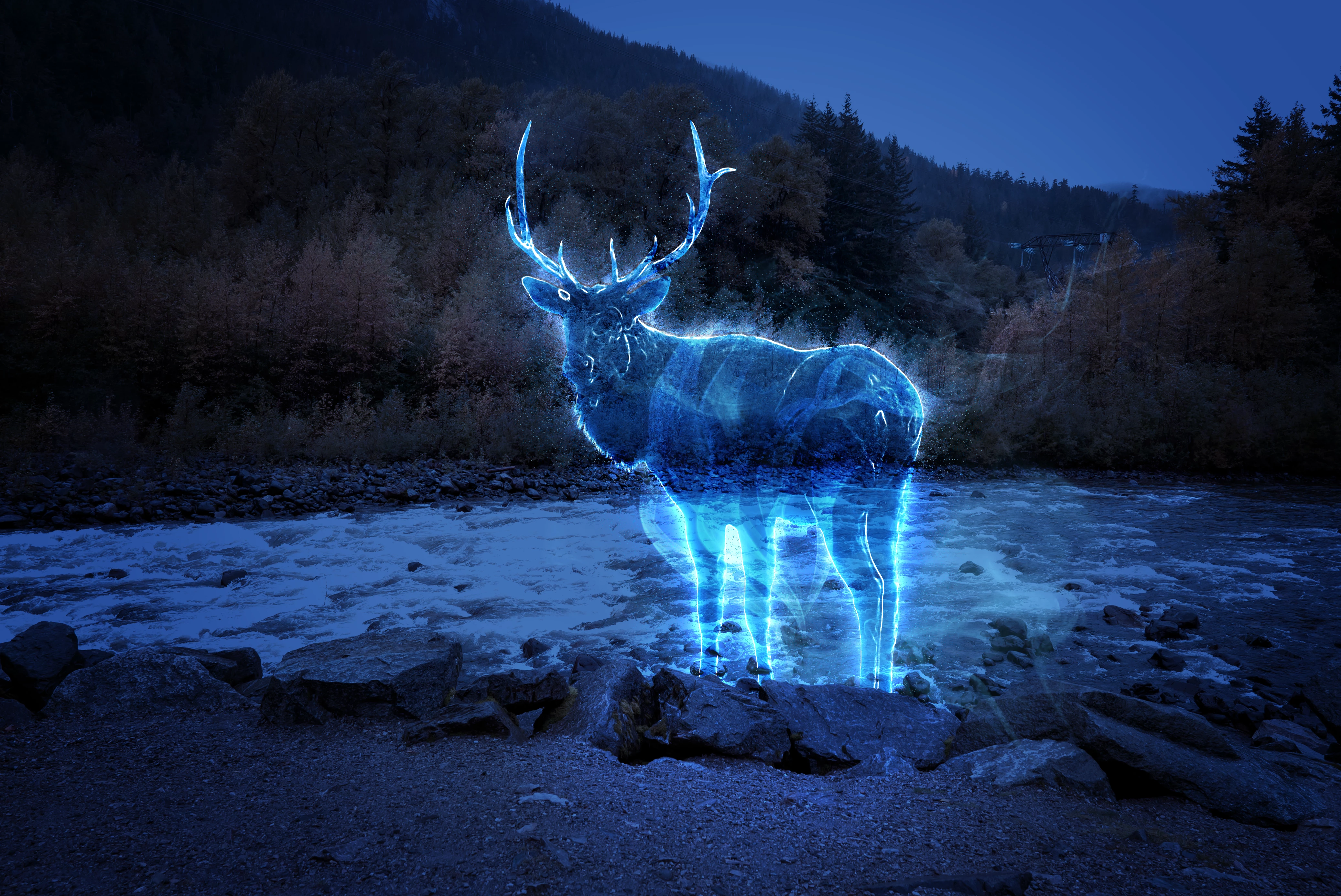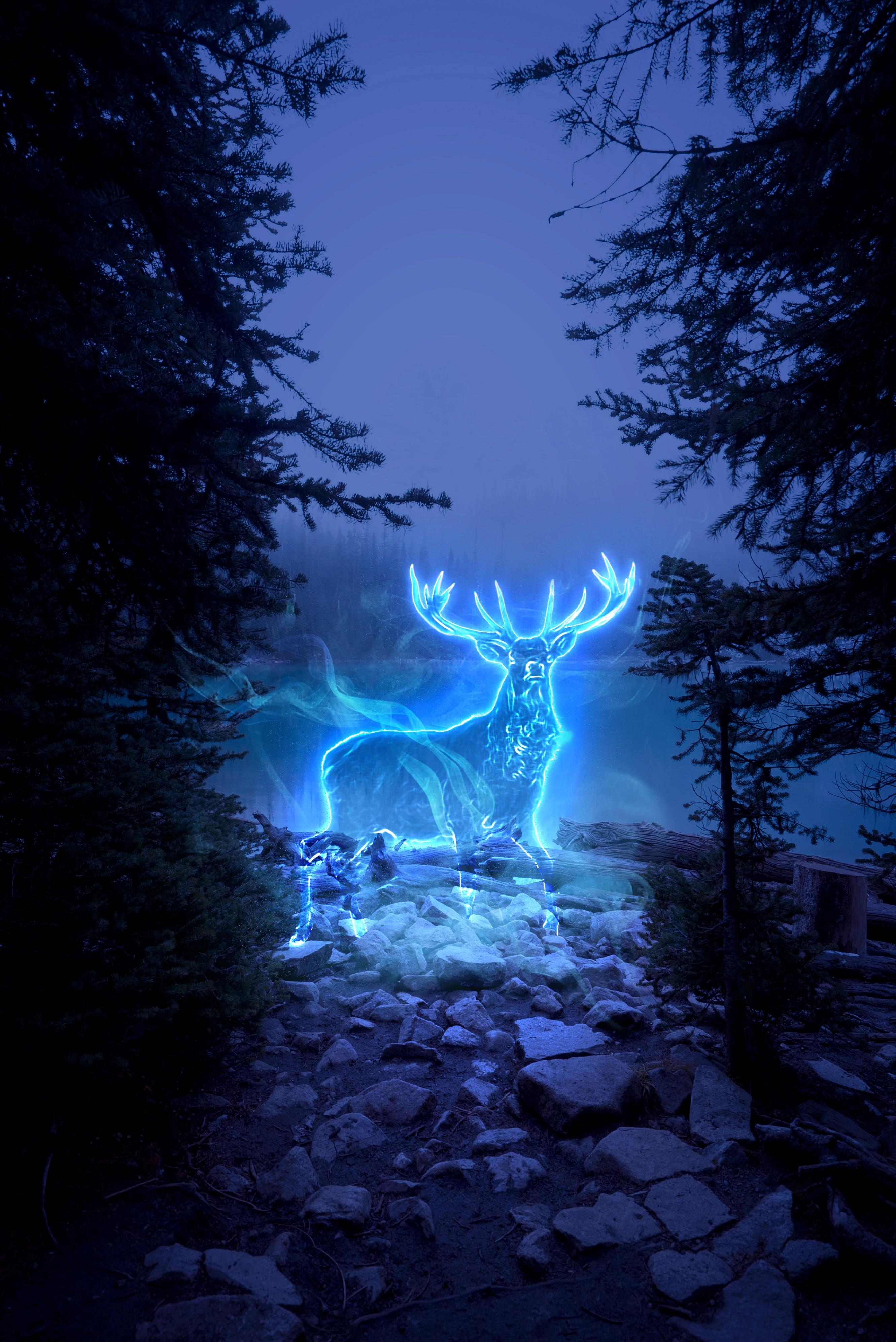 I turned a picture taken in the forest into a night background, and a picture of a deer into a neon shape. Keywords are Halloween, ghosts, and fairy tales.