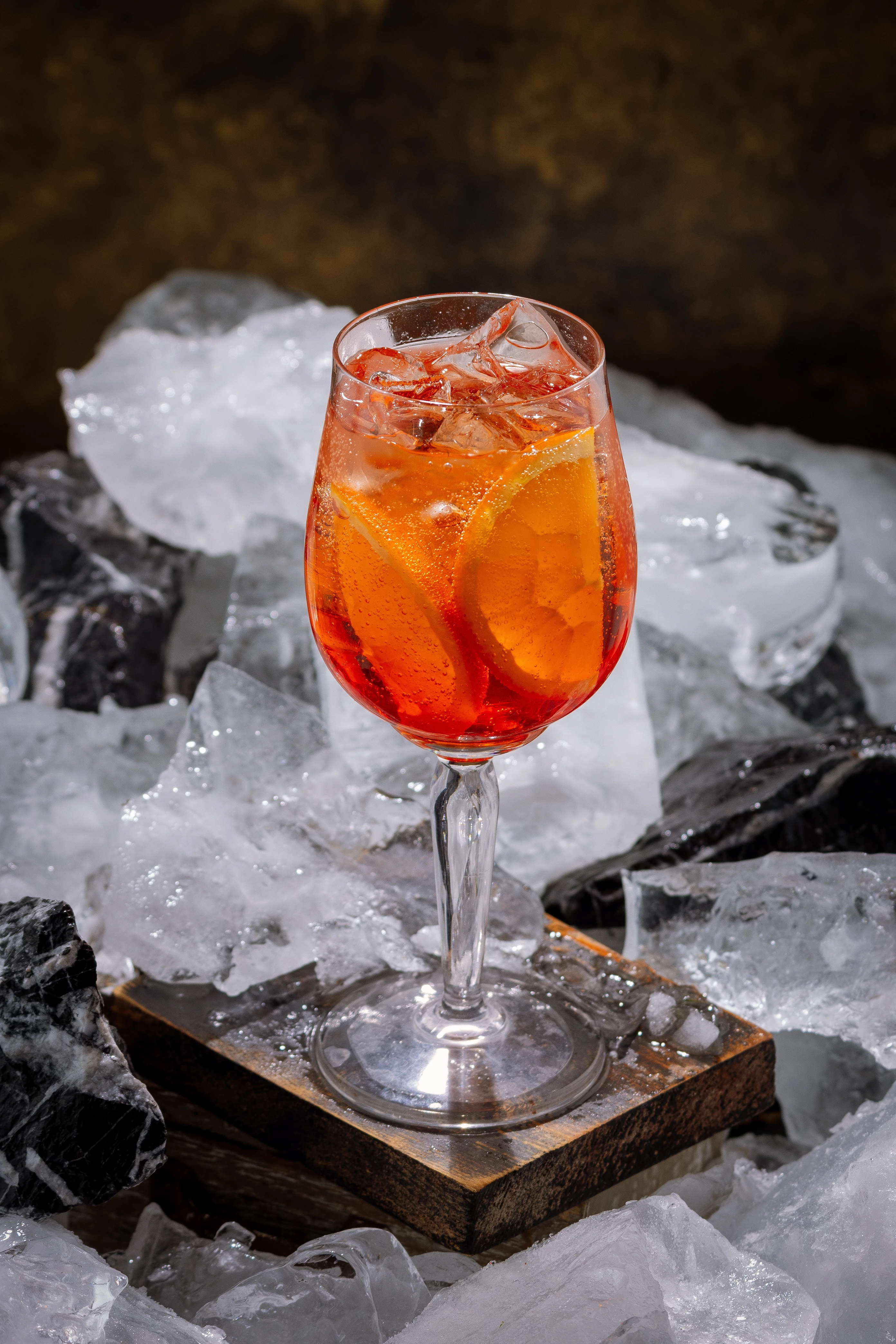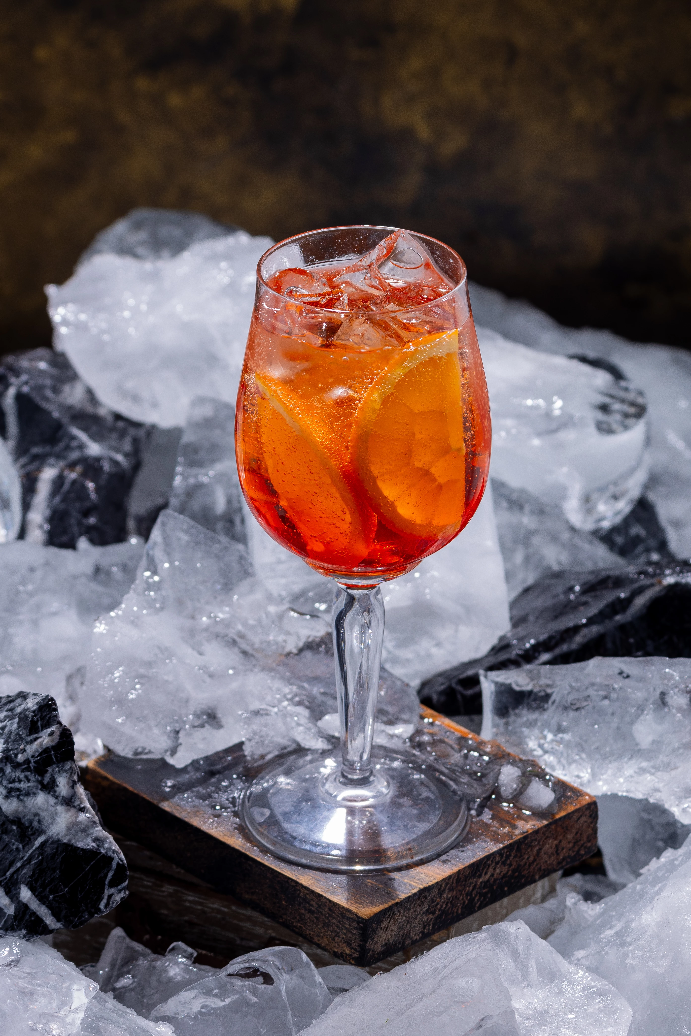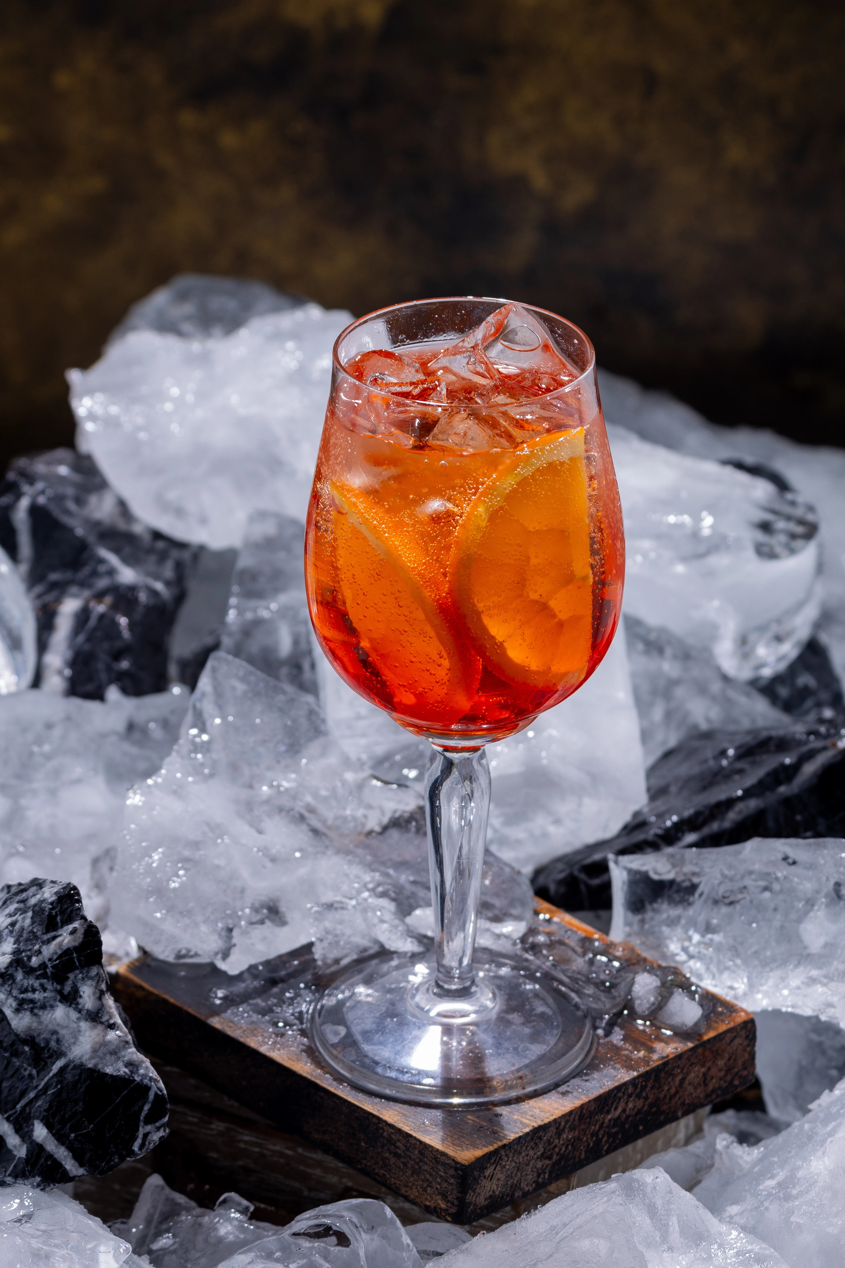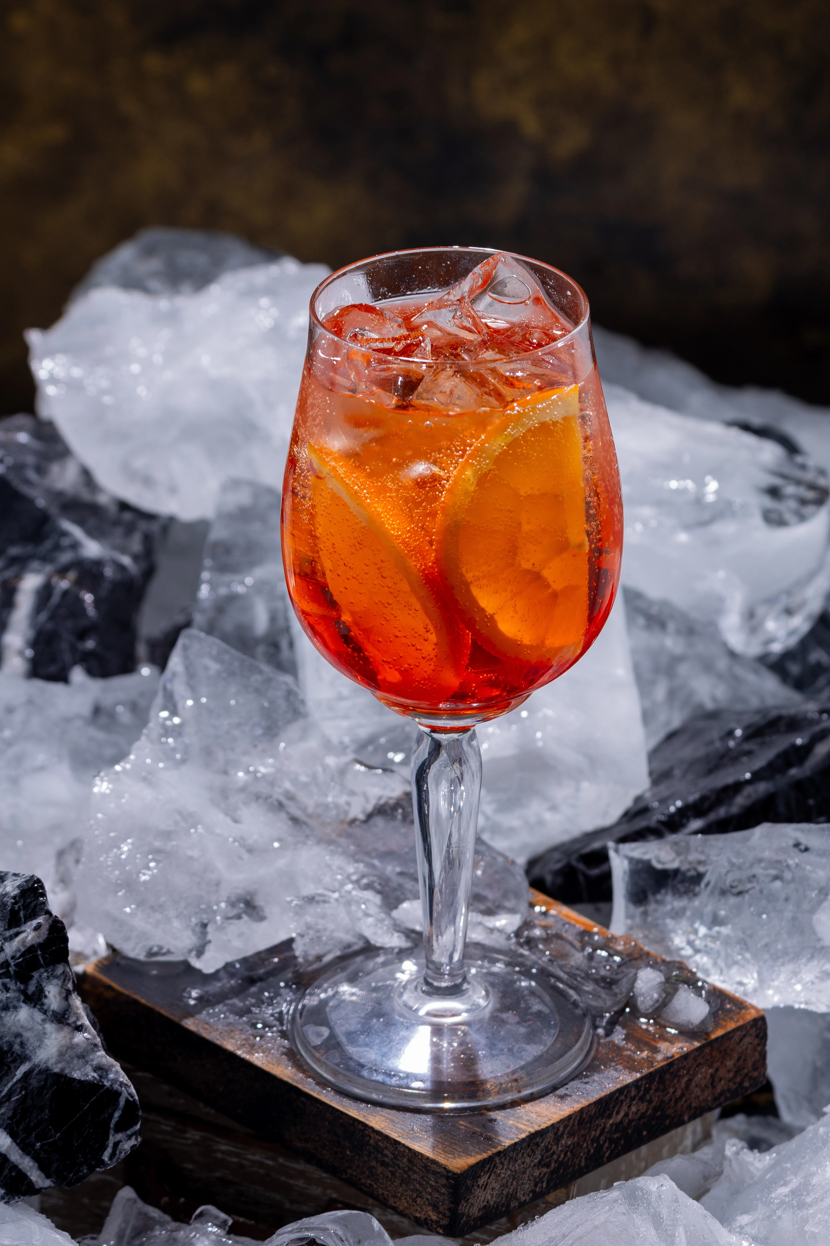 "Aperol Spritz cocktail with orange slices and ice cubes in a wine glass, served on a wooden block with crushed ice. Refreshing summer drink, perfect for bars, menus, and lifestyle use."