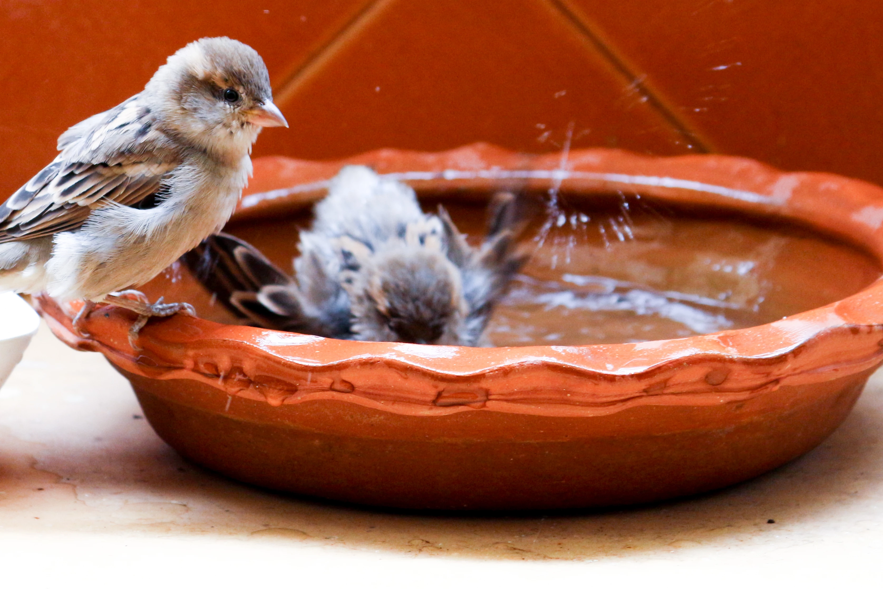 This would have been a beautiful capture. However, the composition is not good. You should not have cropped the bird and dish.