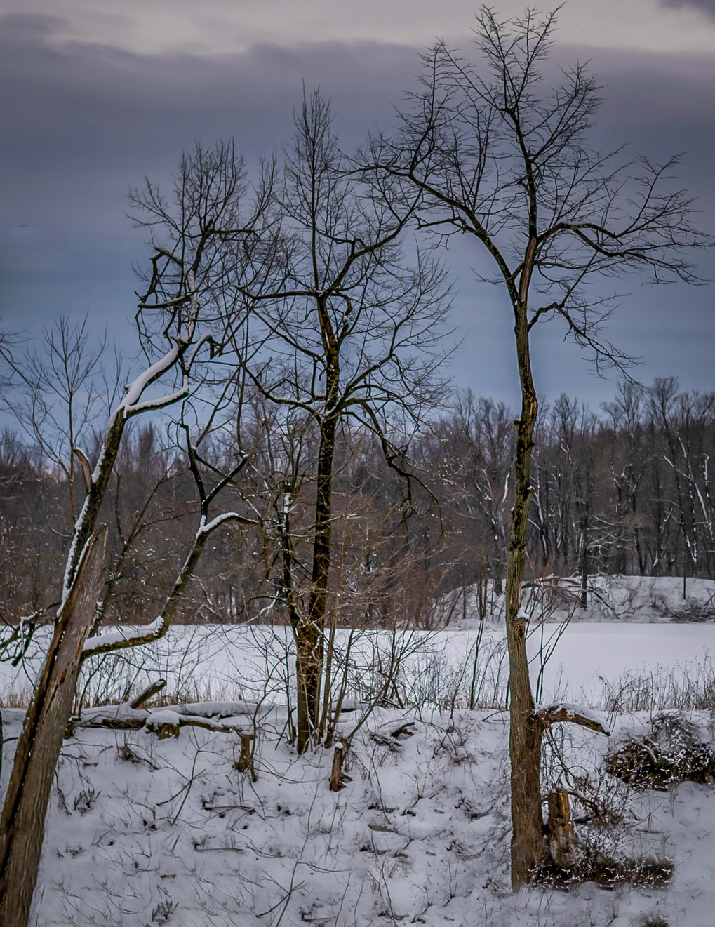 I cropped the image to a verticle orentation. This allowed me to use the Rule of Thirds by placing the horizon on the lower grid line and to show the three main tree elements. This is use opf the Rule of Odds. I used Photoshop to increase the missing canvas at the bottom of the photo and with content aware fill I filled the new canvas space. (Your photo chopped off the base of the trees.)