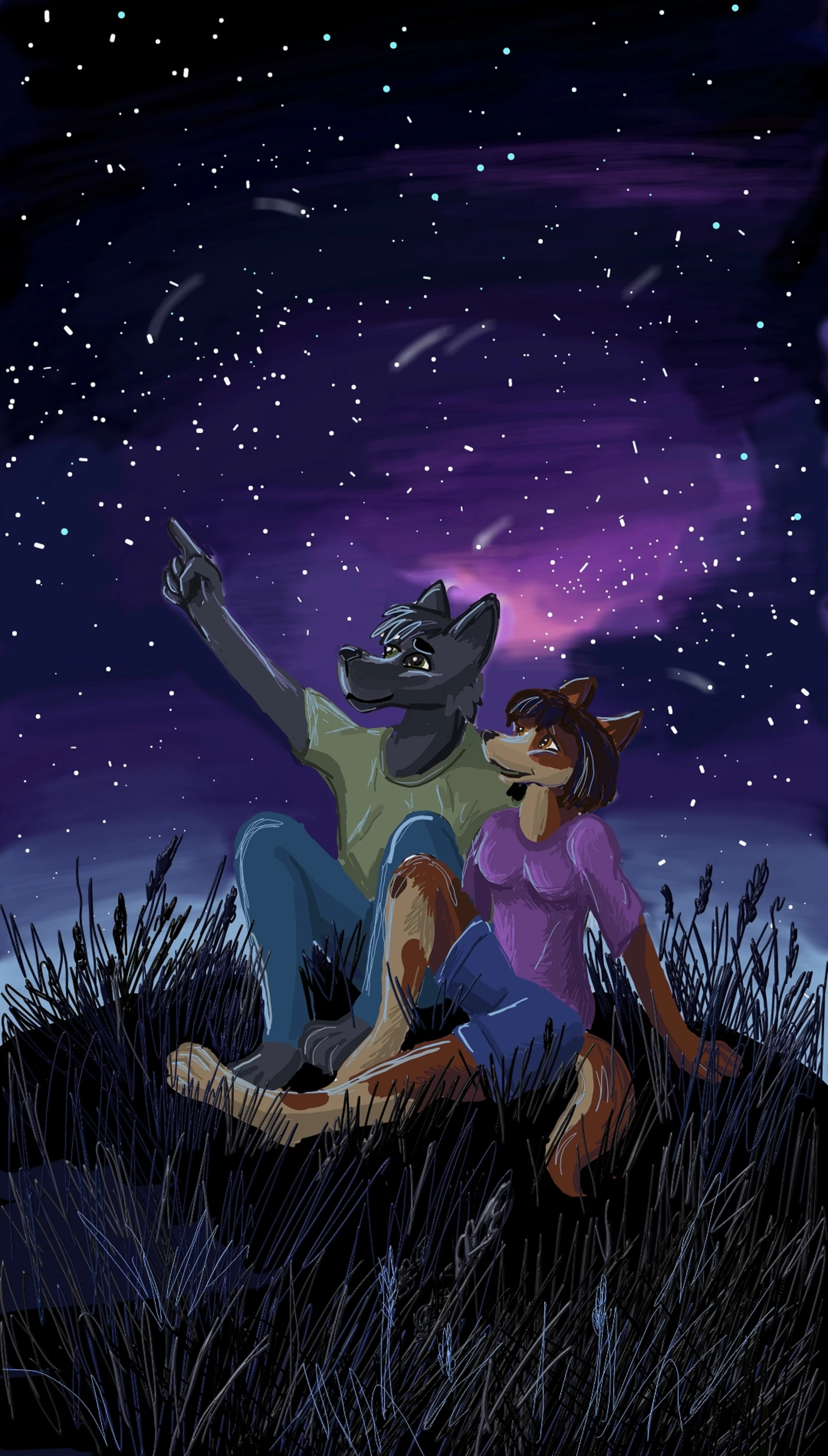 Get to know all these special effects brushes. Try a clean flat sky - take two colors like dark and light blue and use the gradient tool under paint bucket to create a clean pleasant sky background. Use the curves tool under Mode and play with sky colors. You can use special effects brush for stars - Kyle's spatter brush 204. You can copy your two characters and put them on one layer and work on them. Then put the sky on another layer and play with the colors and stars and please, no sxcessive smudgy spots in the sky. Glow in the sky might be better using a filter for rendering a lens flare which you can adjust. Experiment!