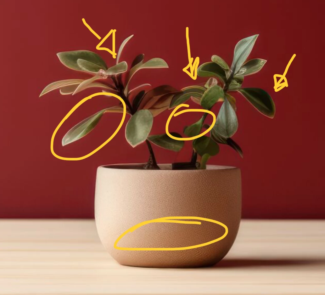 5. Leaves are blurry and malformed. Wall texture is odd - smooth in some places and textured in others. The scratches don't make sense either.