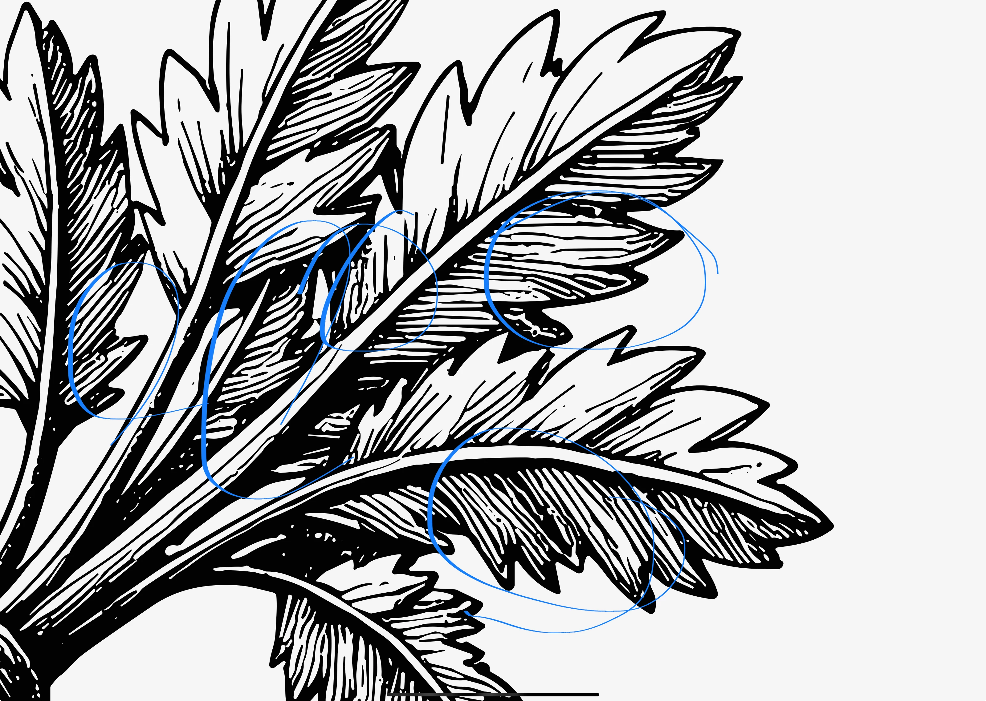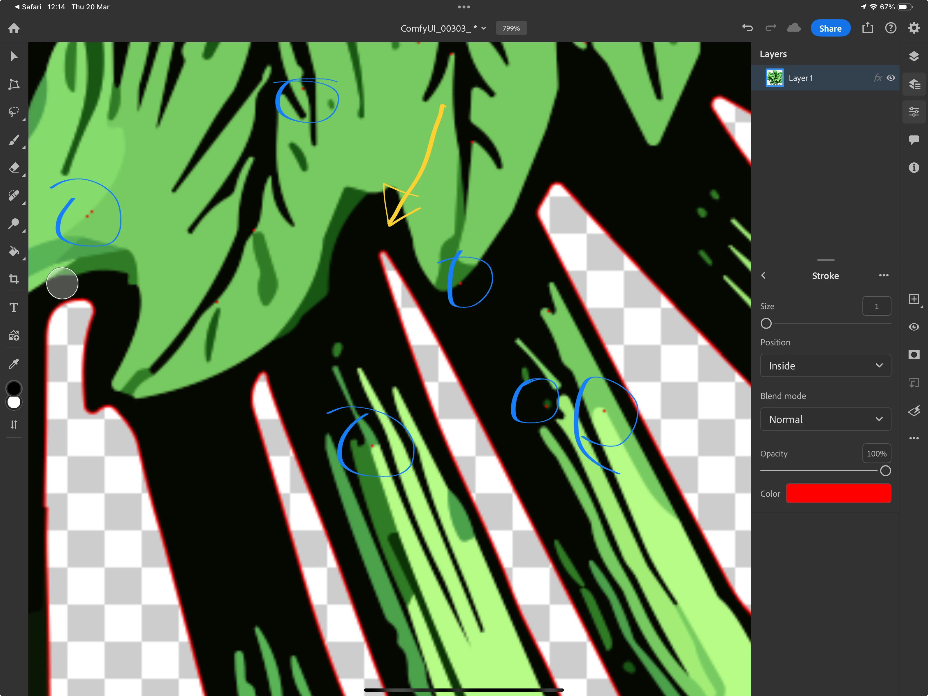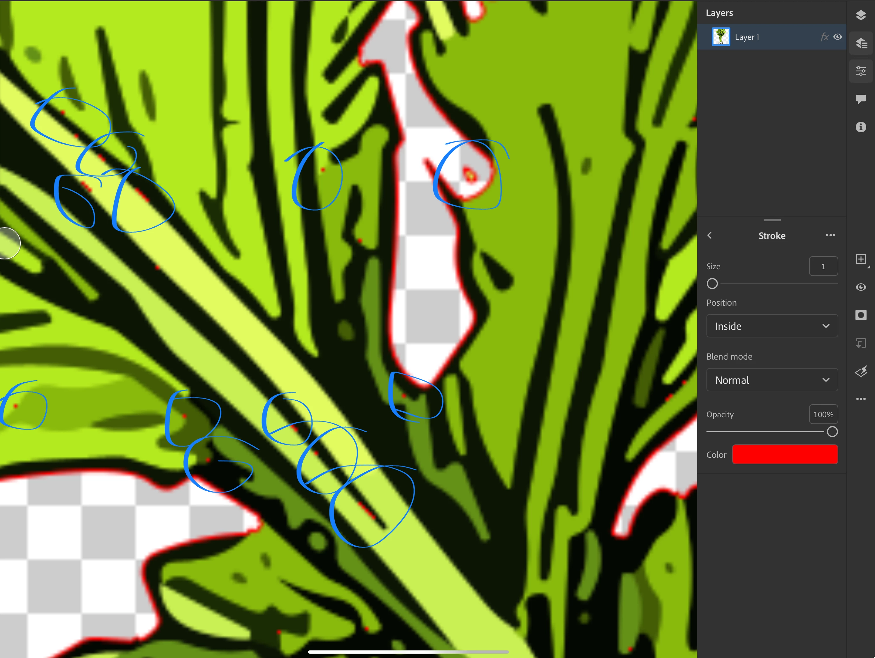 Blue: cutout errors (transparency where there should be none. You see that well with the stroke effect.