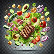 File Name: A dynamic scene showing various ingredients for a steak salad