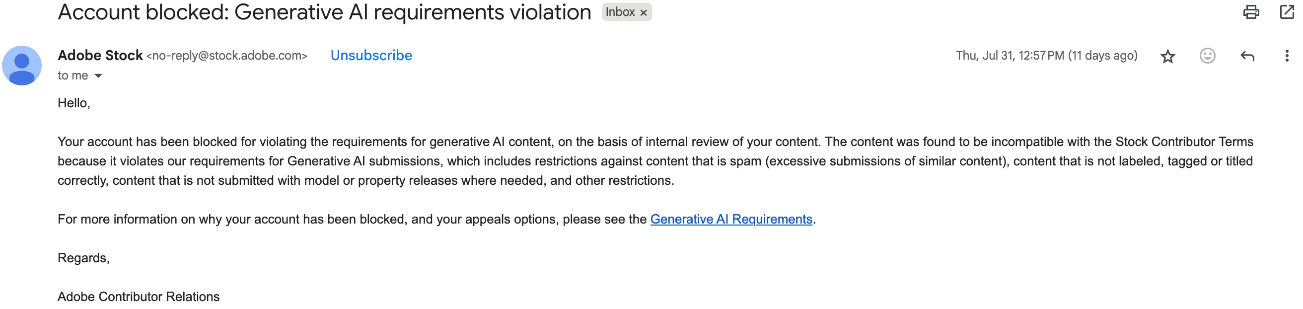 My Adobe Stock Contributor account was recently blocked for allegedly violating the Generative AI submission requirements. I believe this may be a mistake, as I take great care to follow all guidelines.