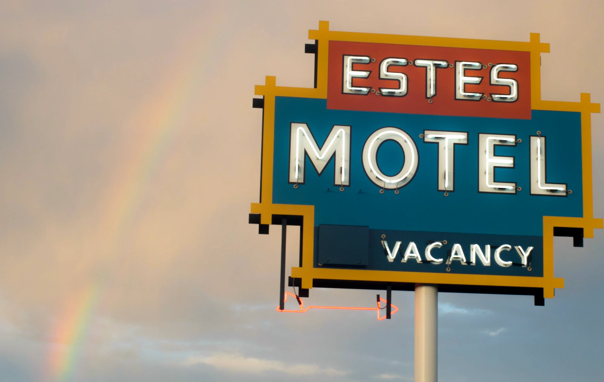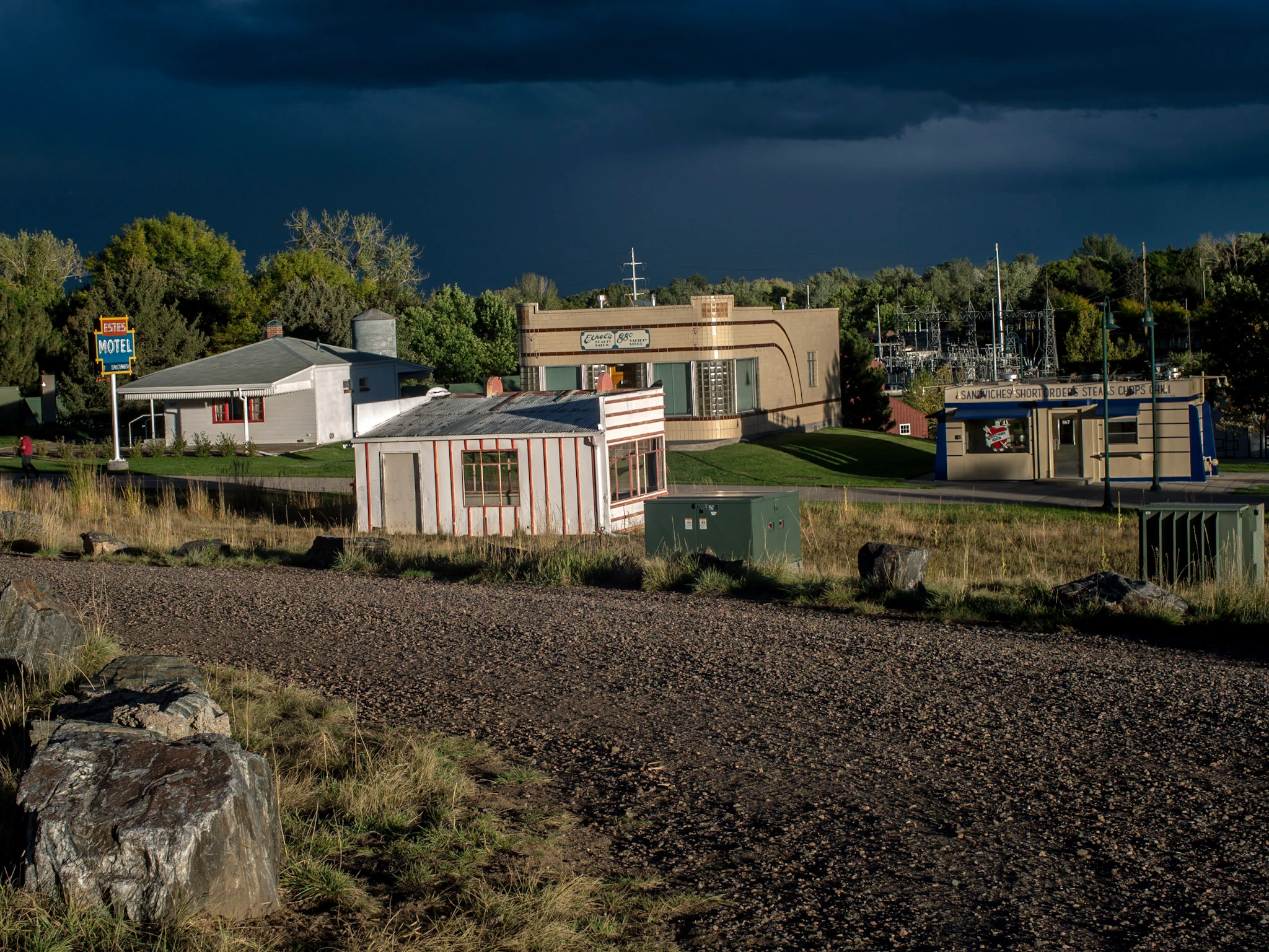 The images are of some historic buildings and signs that have been moved to a city park to help remember the heritage of the area. Many of these businesses closed decades ago and these buildings are no longer actual places of business. As far as I can tell by looking for information about it on the city's website, the park has no restrictions on the use of images taken there. In fact it is a very popular park for wedding photographers.