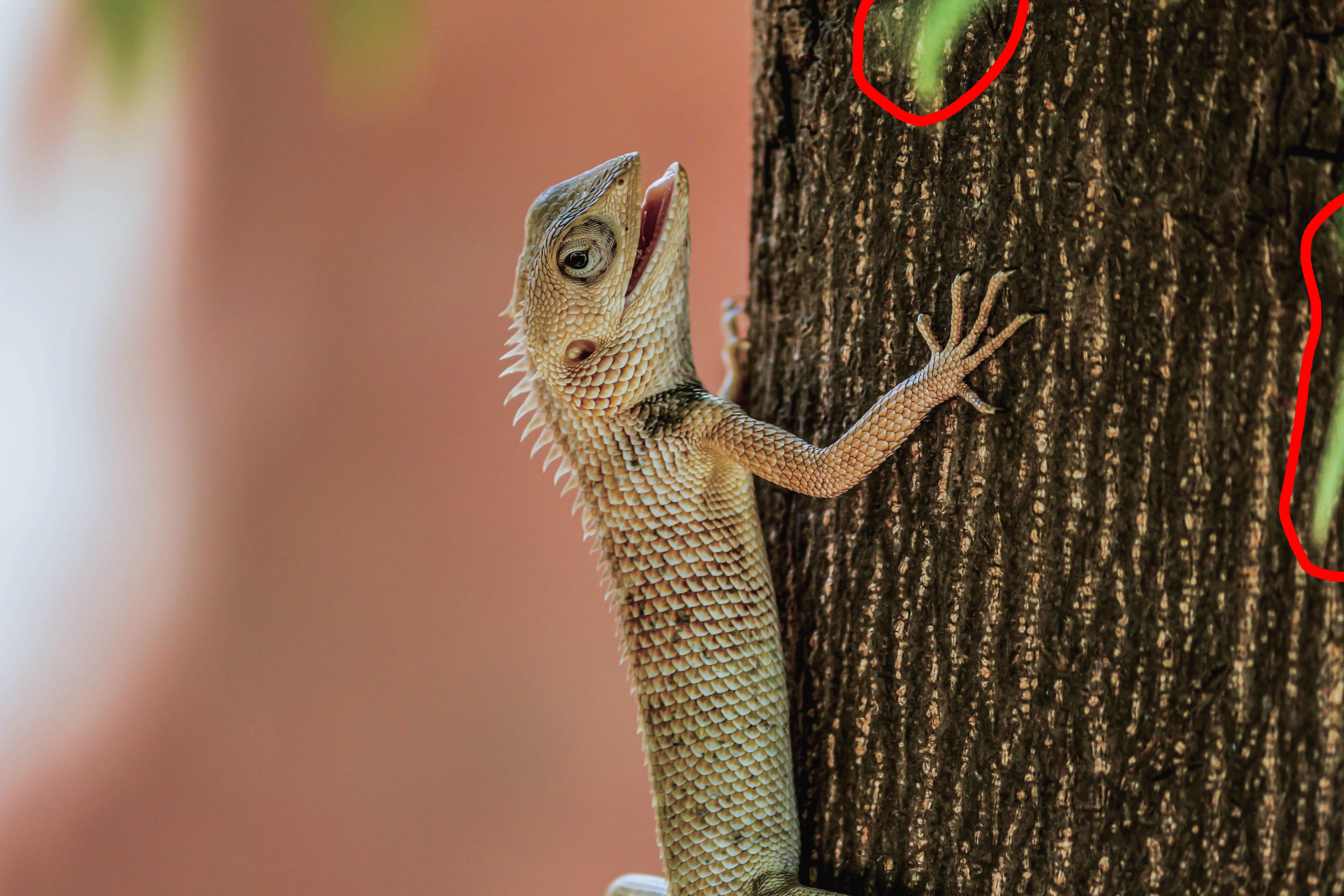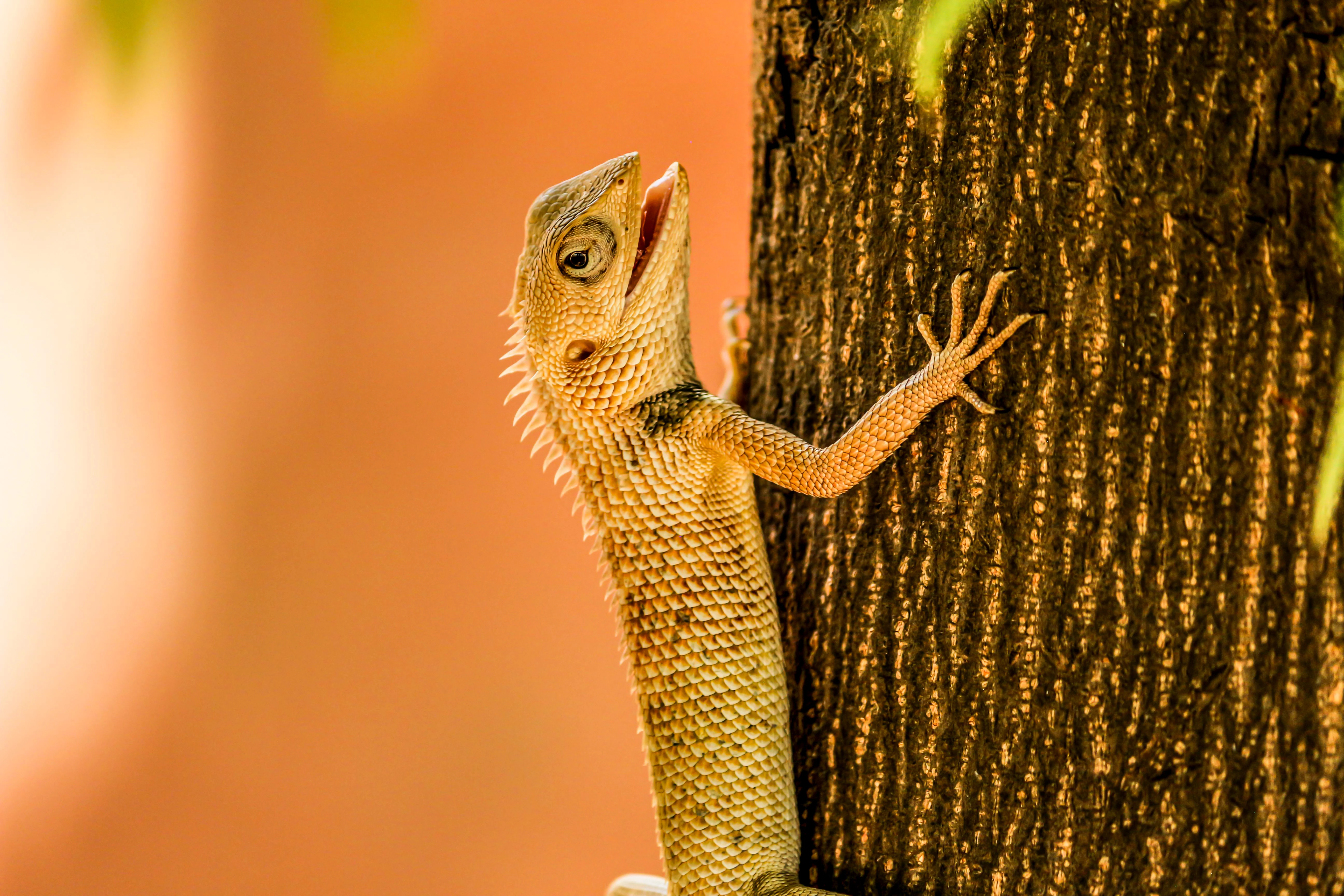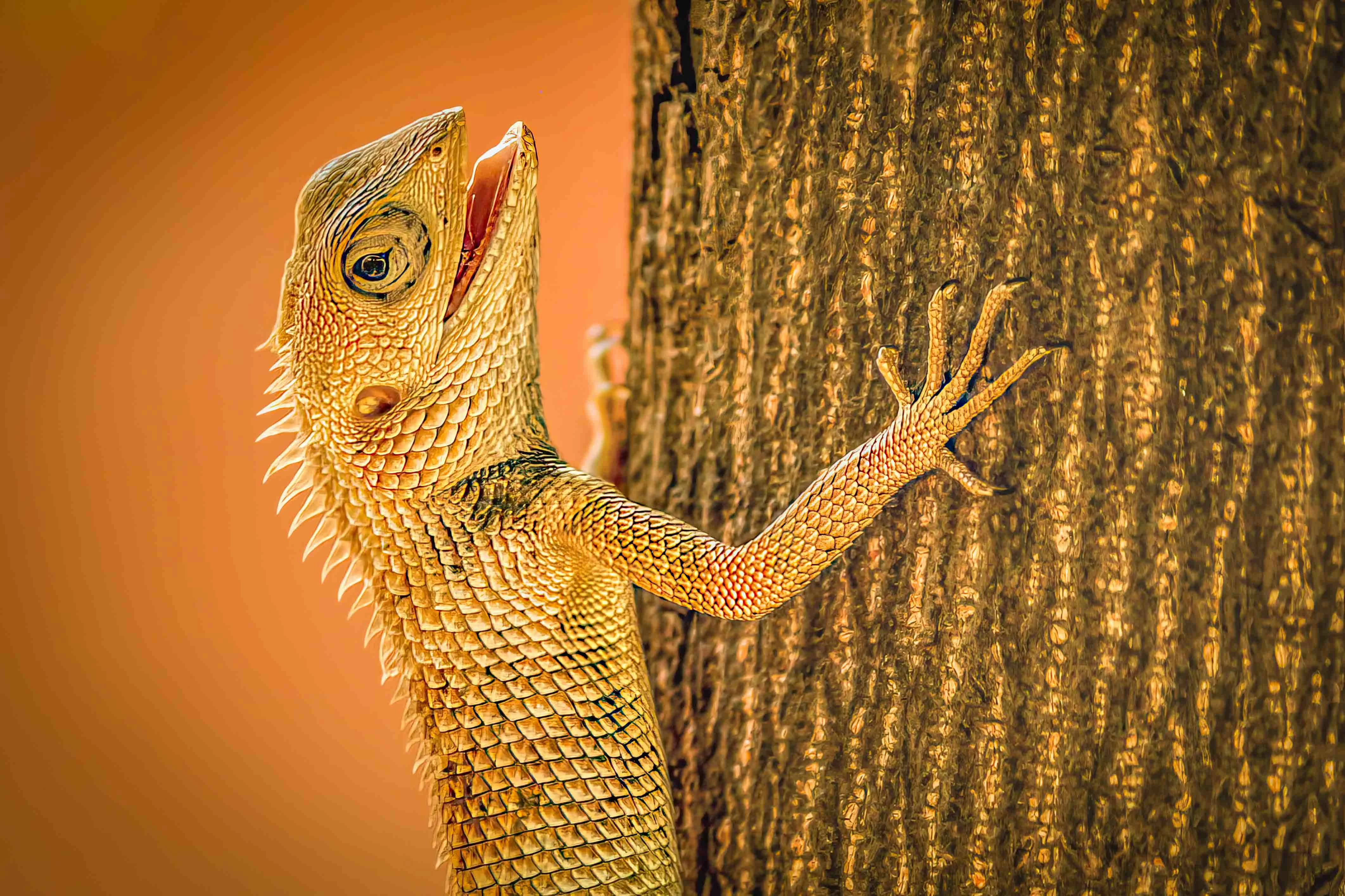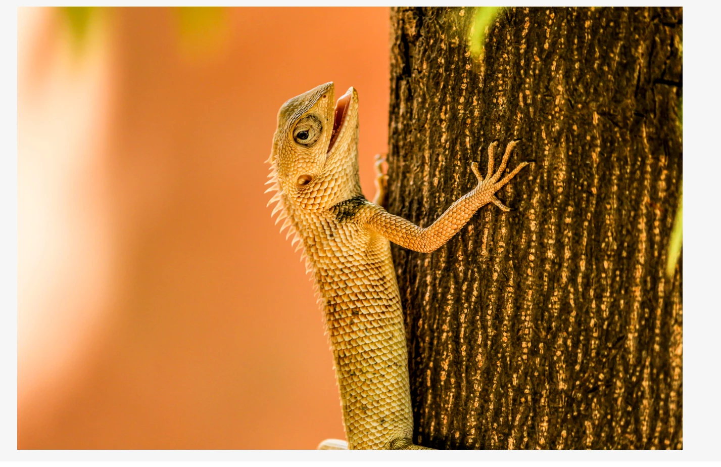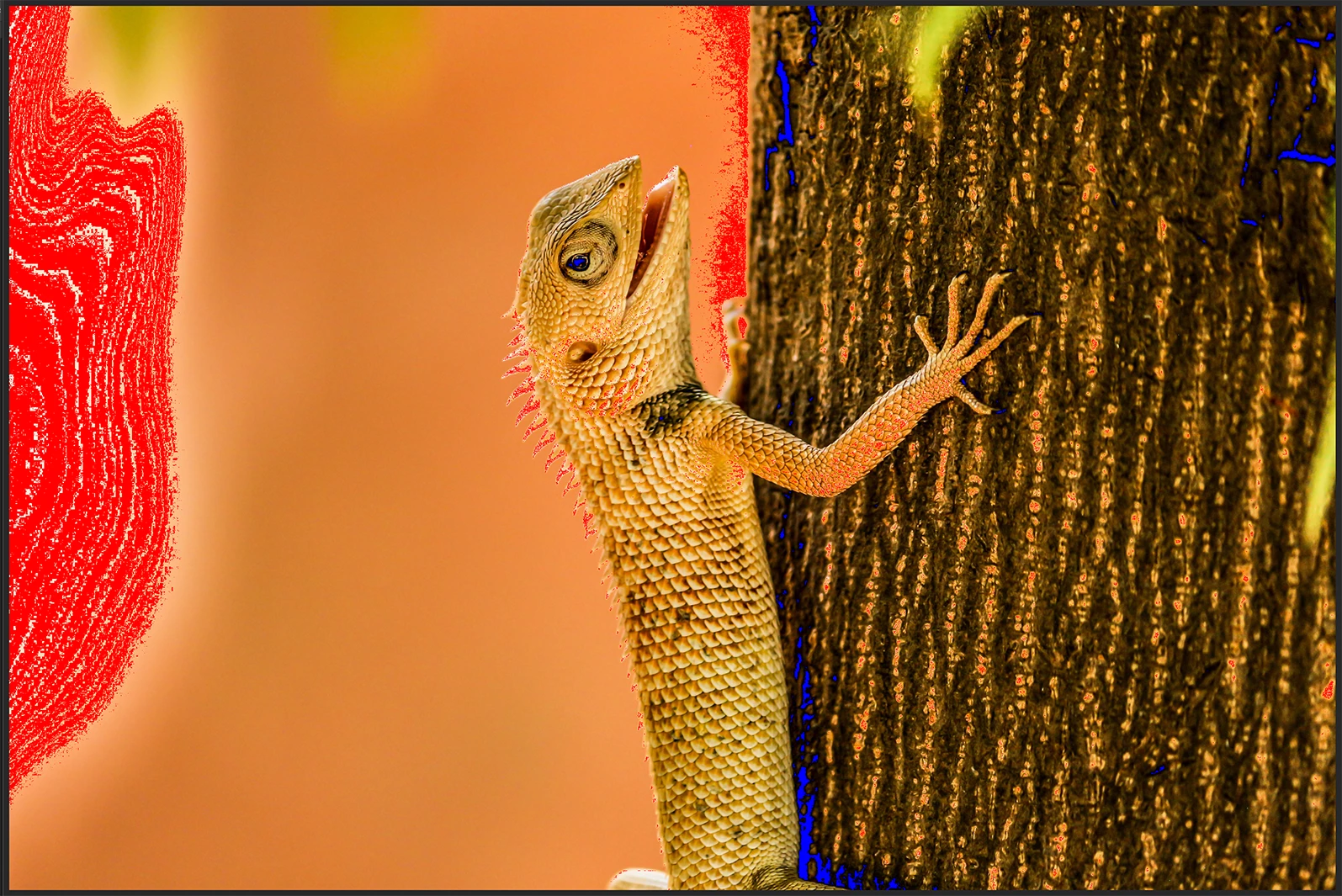 The composition is not very good, you will need to get rid of the cut off back legs. Your colour balance is bad. As I do not have a correct visual clue on the lizard, I know that trees do not have this yellow/orange colour.