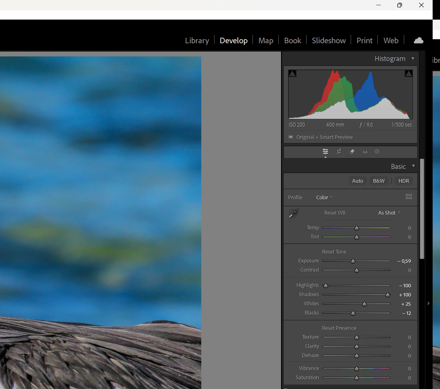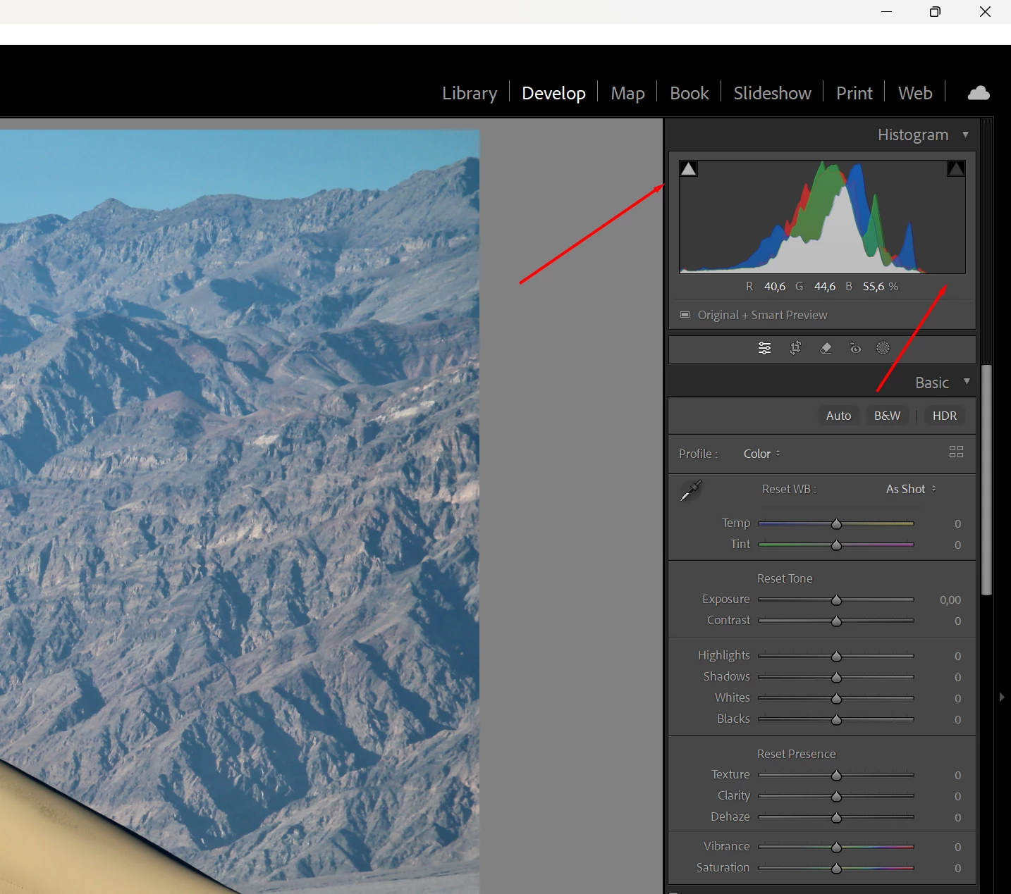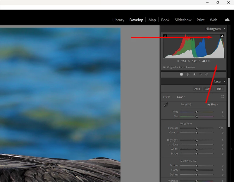 You can correct the exposure issues in Lightrooms basic settings. Notice how the histogram now looks?