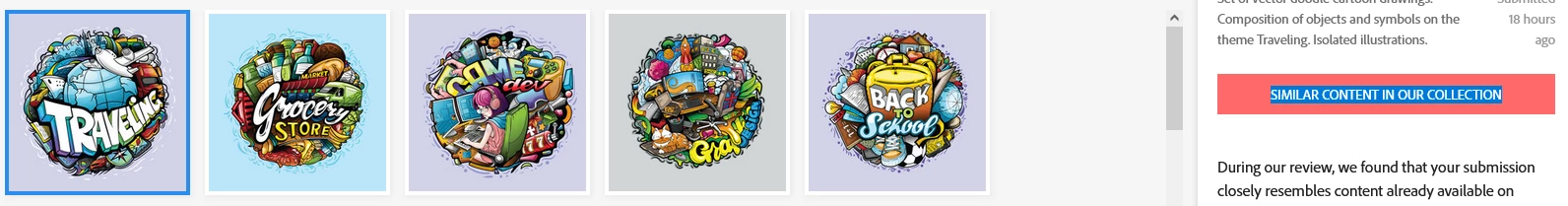 Good day. I uploaded 10 images of this style on different topics, 5 of which were accepted and 5 were not. The motivation is: Similar content in our collection. Sorry, but I have not come across anything like this. I have sketches that I can provide, these works were made by me and I can prove it. Can you show me where they are repeated? I worked on them for a long time and in the end this is it. In this way, you limit the authors and they lose the desire to work with stocks. Please review these works.