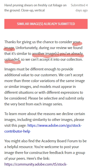 I do not understand why everything is so with the acceptance of files now. I took a picture of a garden shears for the first time in my life, I submitted this one photo for review, but it was rejected due to a similarity. Up to this point I do not have a photo - NO ONE of a garden shears in my portfolio - neither in hands nor in isolation.