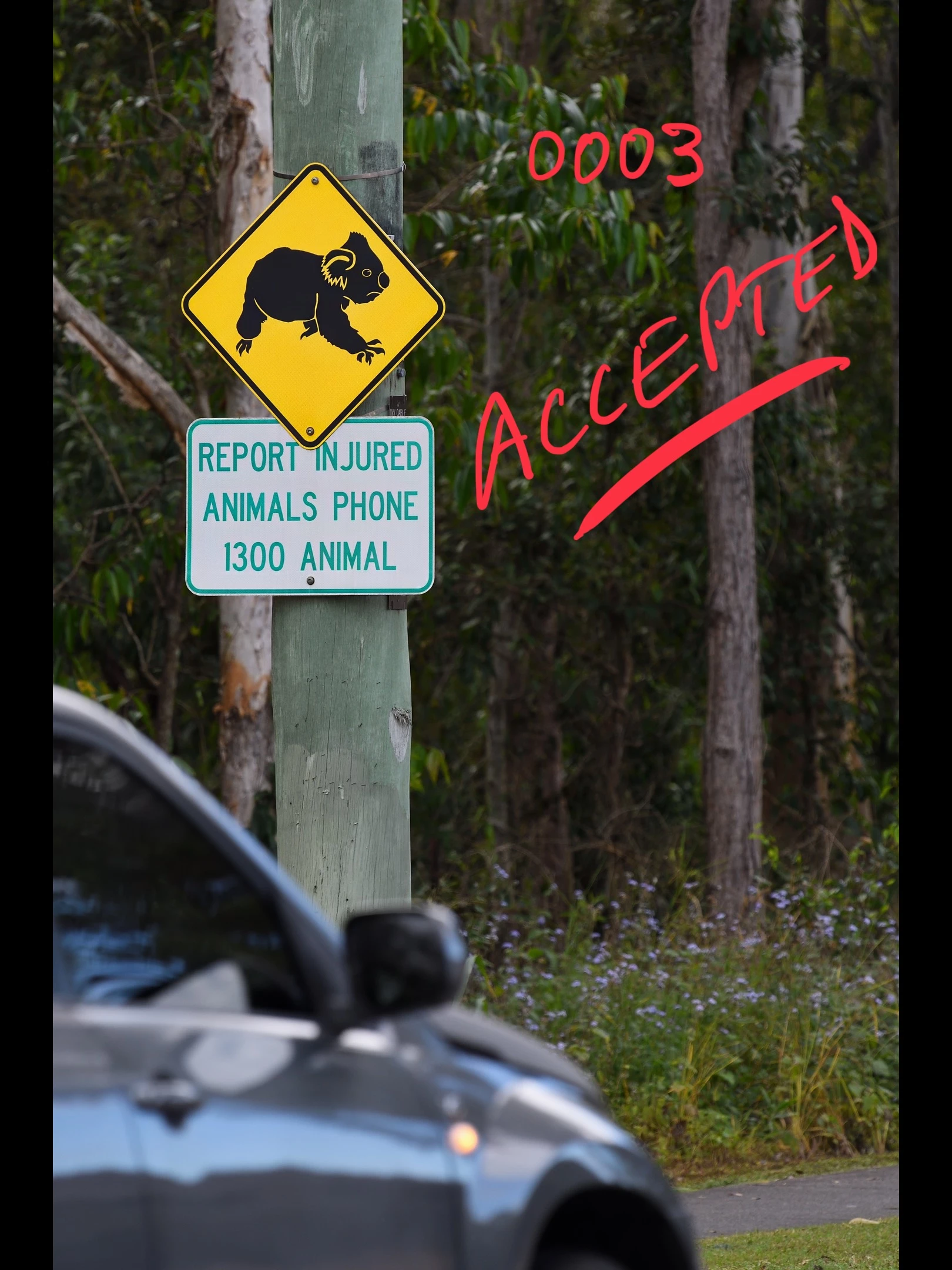 closeup, yellow, black, koala, crossing, phone, hotline, warning, sign, vehicle, driving, by, qld, australia, copy, space, report, injured, accident, injuries, signpost, car, road, street, highway, traffic, zone, safety, awareness, animal, marsupial, queensland, portrait, orientation, format,