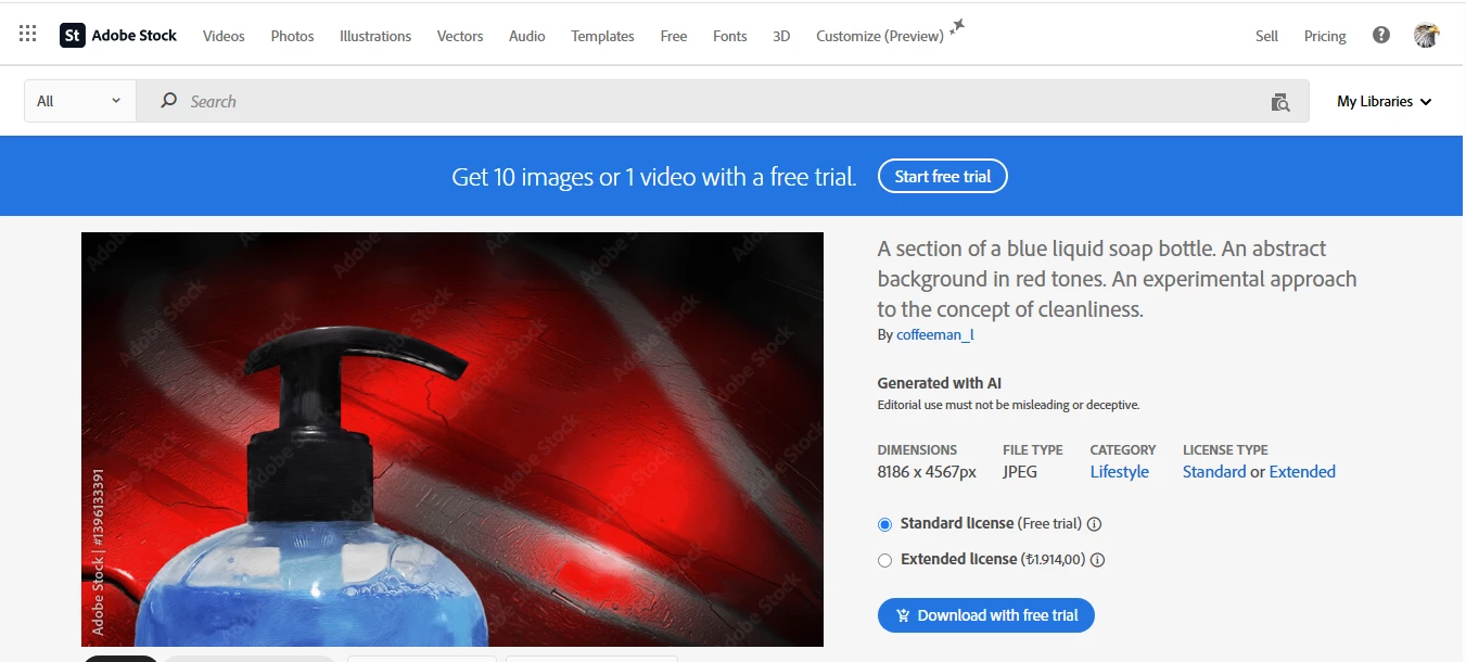 When I search for "Liquid Soap" on Adobe Stock (via Canada), exactly 672,553 results appear. If I search for "Blue liquid soap", the results drop to 218,105. It is also interesting that a topic with 672,000 equivalents is approved these days without being bothered by the concept of "similarity".