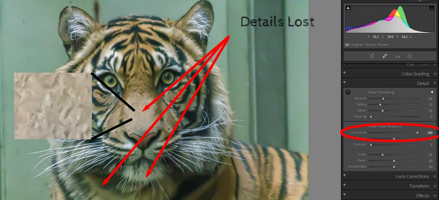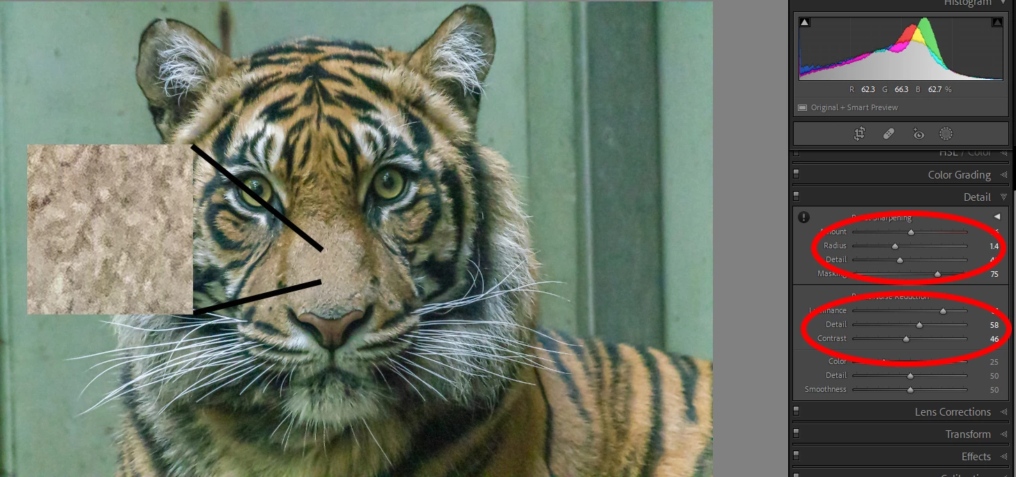 I readjust the Luminance slider to remove ass much noise as possible from the subject while still showing details. At this point, I am not worried about the background. I then slightly sharpen the subject.