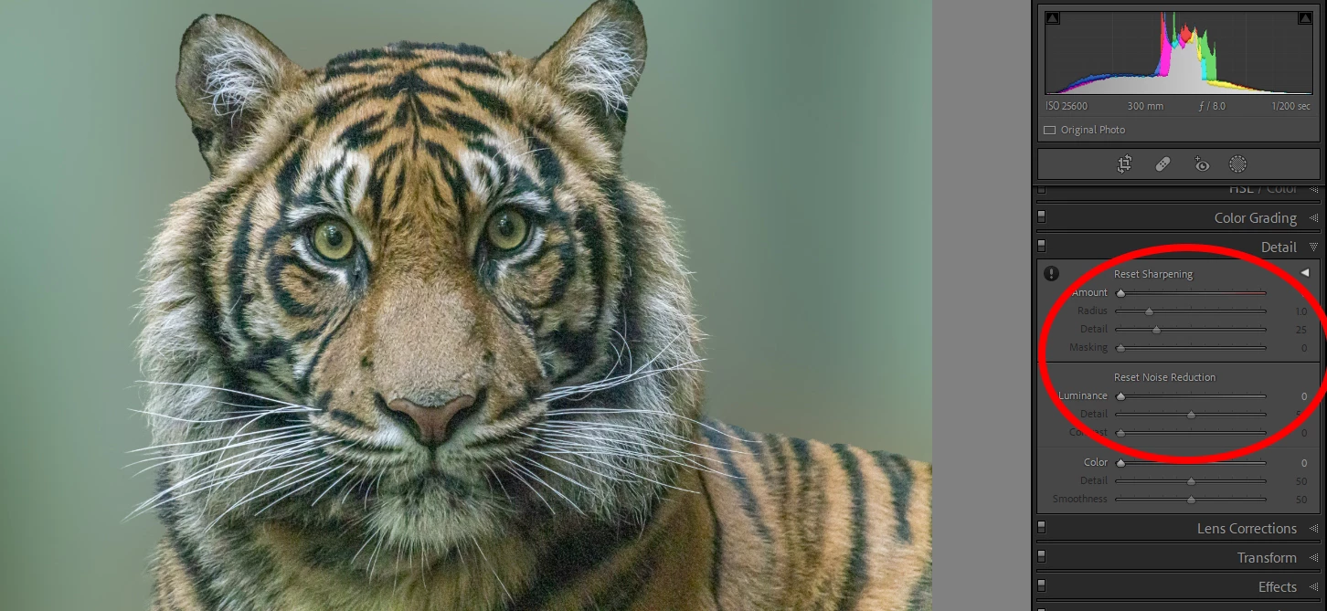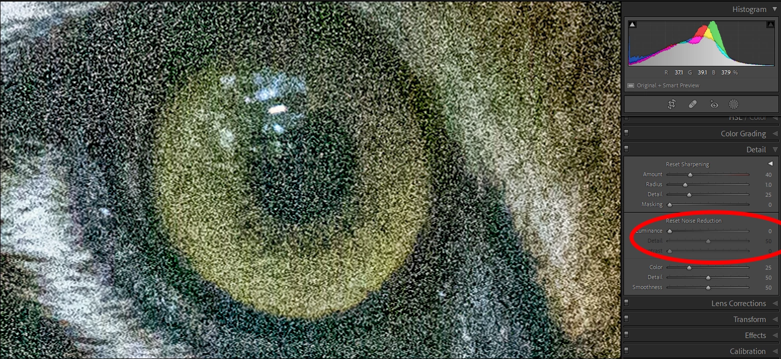 The eyes, which must be sharp, also show a lot of noise. The noise reduction Luminance slider is still at 0.