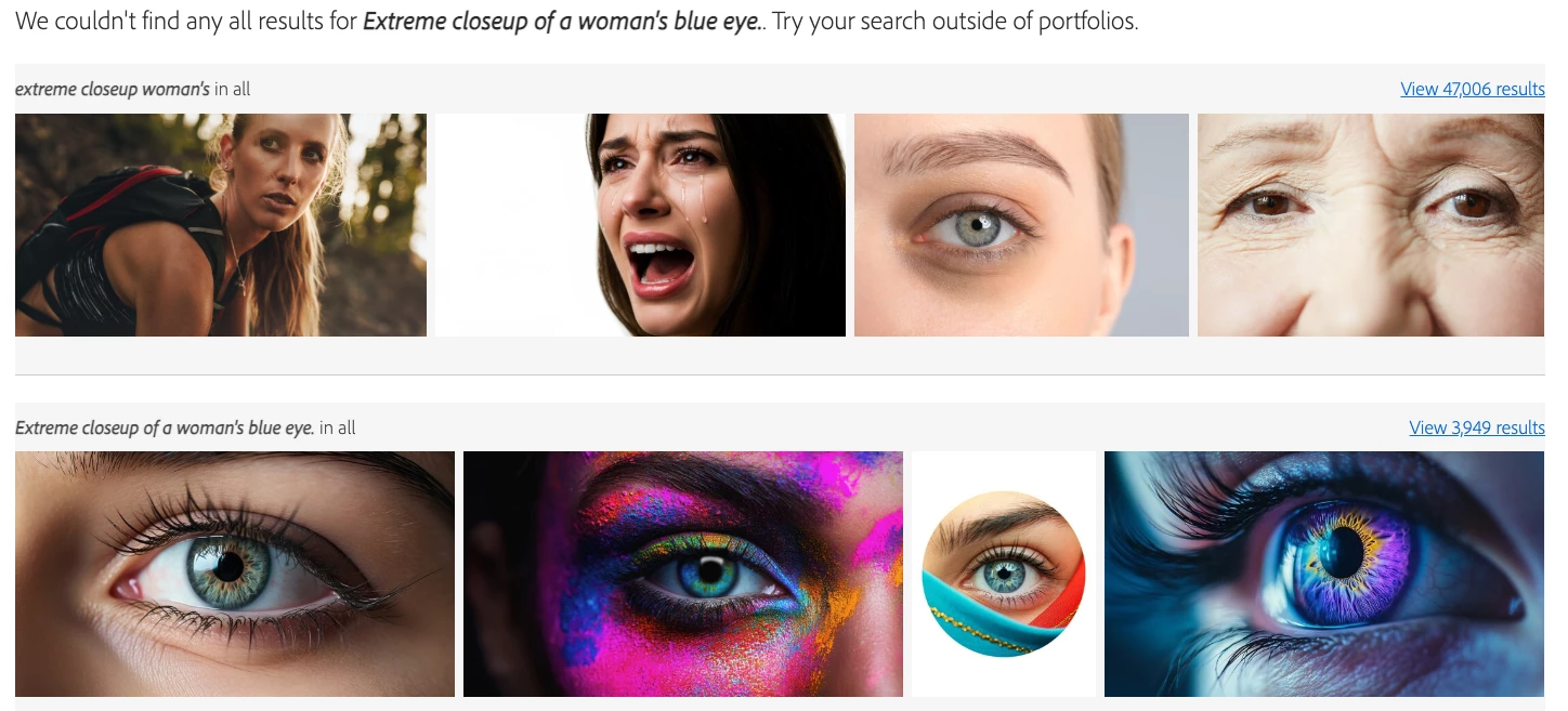 So I got more specific and entered the exact title of one of my assets (second one from the left at the bottom with the pink and blue makeup). It showed up, but I also got the notice that nothing could be found and to "try searching outside of portfolios," as per the example below.