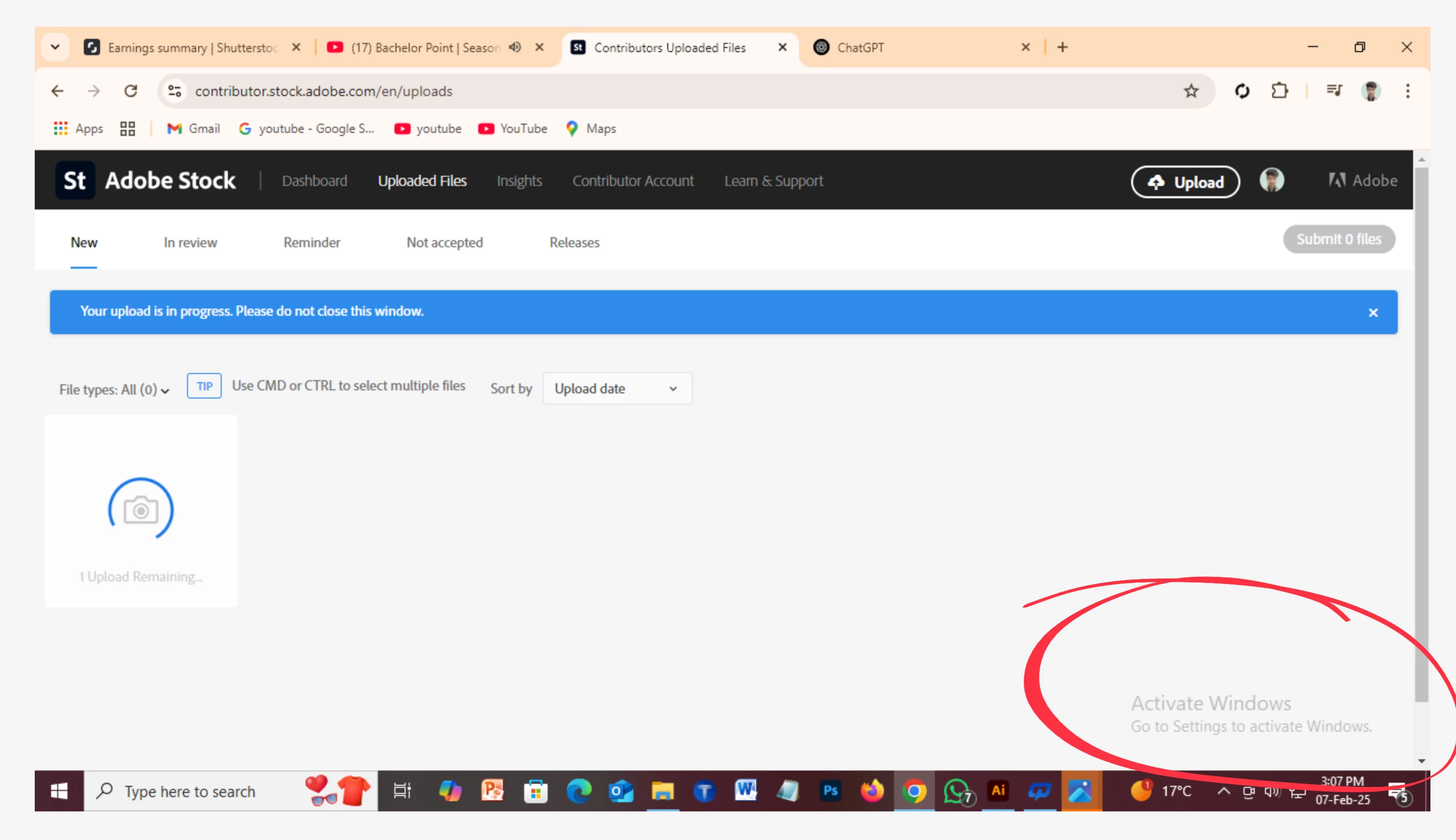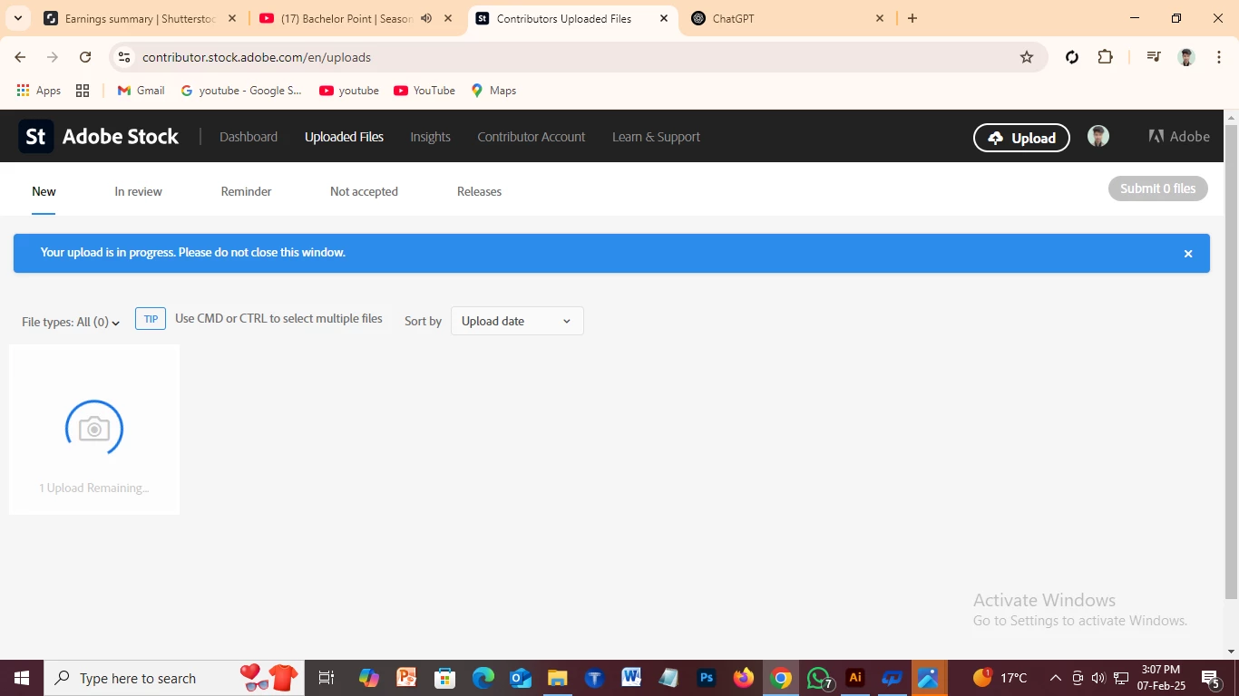I am facing a serious issue while trying to upload files to my Adobe Stock contributor account. Whenever I attempt to upload a file, it remains stuck at "Upload Remaining" and never completes. Despite trying different files and browsers, the issue persists.