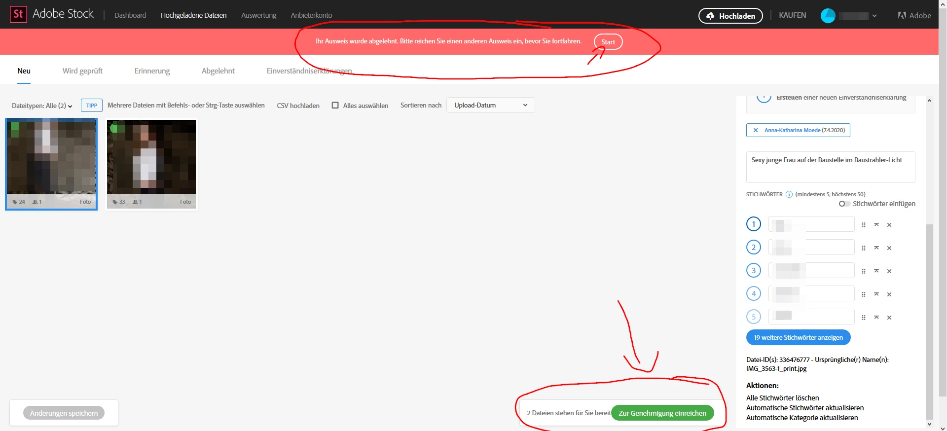 On the bottom there is a german text about my identification paper is declined. I should upload another one but I can't click the Start-button, too. It just happens nothing. I tried in the newest Firefox and Google Chrome Browser.