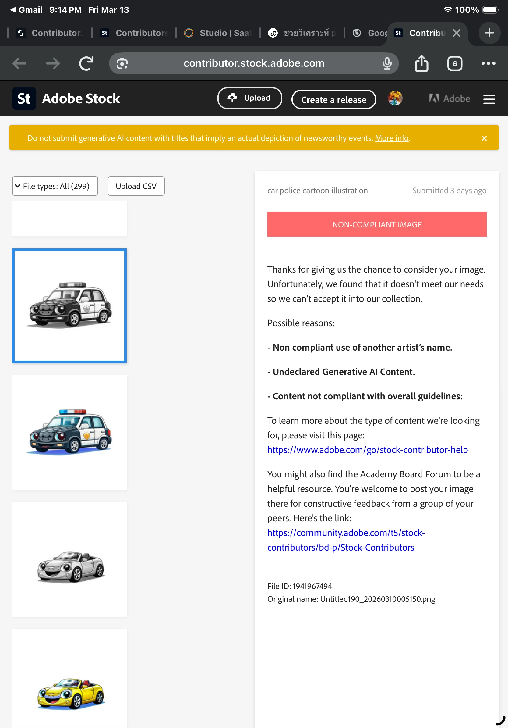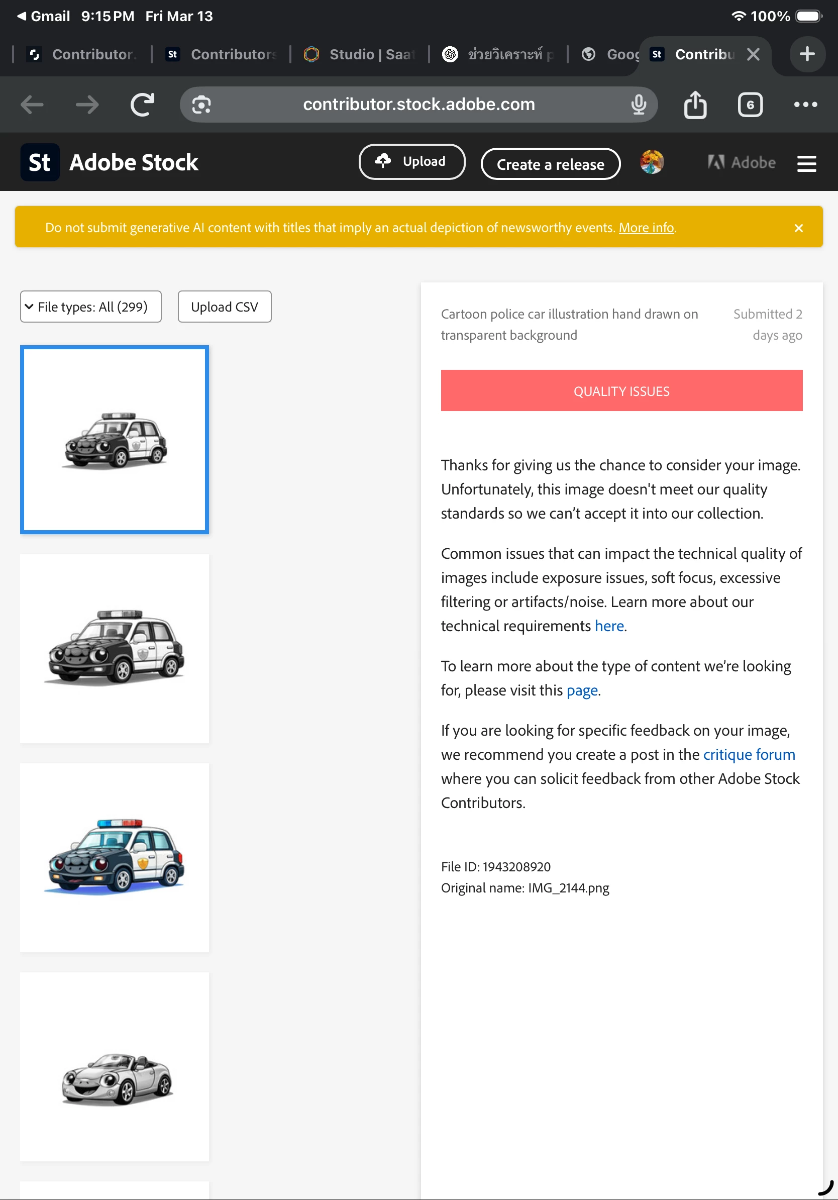 - The Pivot: After I resubmitted with adjusted file sizes and metadata, the "AI" and "IP" reasons vanished. Now, the system claims "Technical Quality Issues."