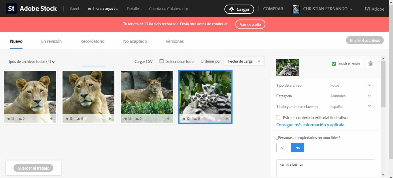 Hola, ya tengo mi cuenta de Adobe Stock, he podido cargar unas fotos y he llenado el formulario correspondiente de TAX, pero no puedo envier archivos debido a que aparece un mensaje de Tarjeta ID rechazada, me pide enviar otra, pero el link no funciona, no me direcciona a ninguna pagina, no se si exista algun inconveniente por mi Pais.