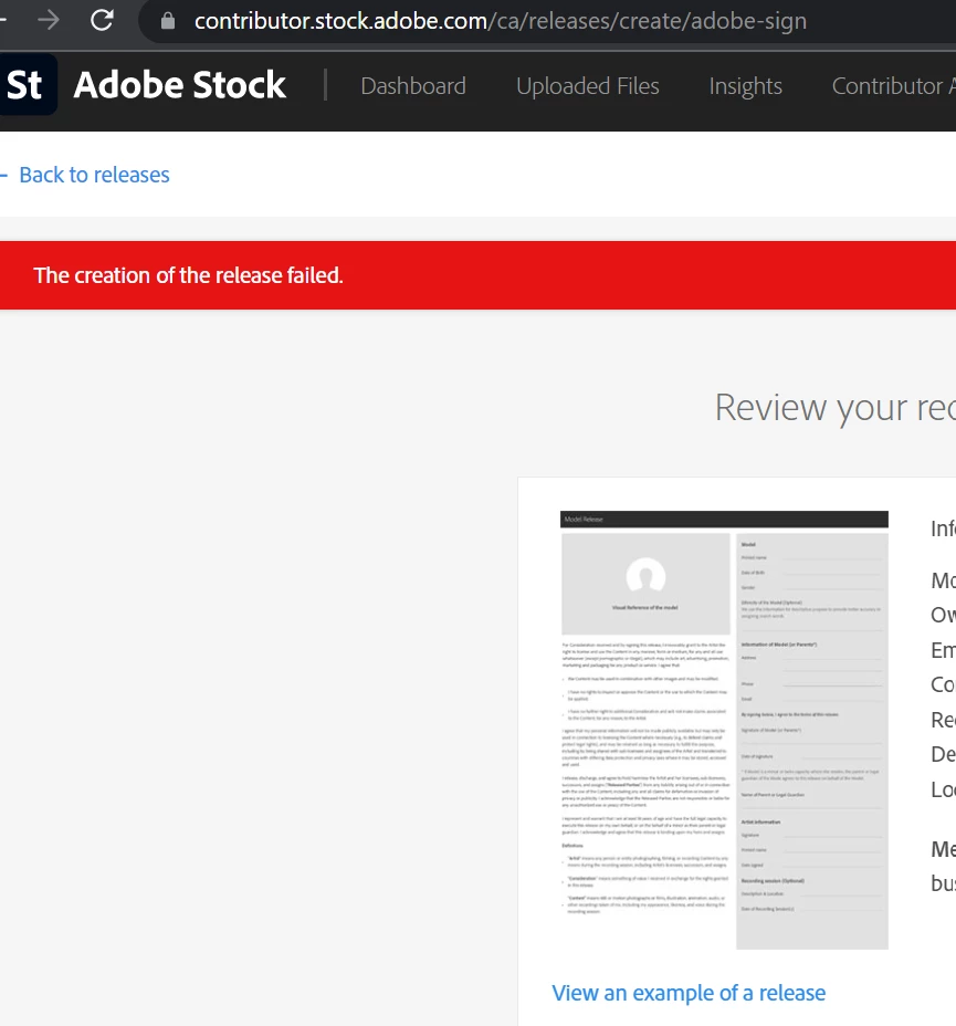 However, yesterday I keep getting an error just before I send the Property release.