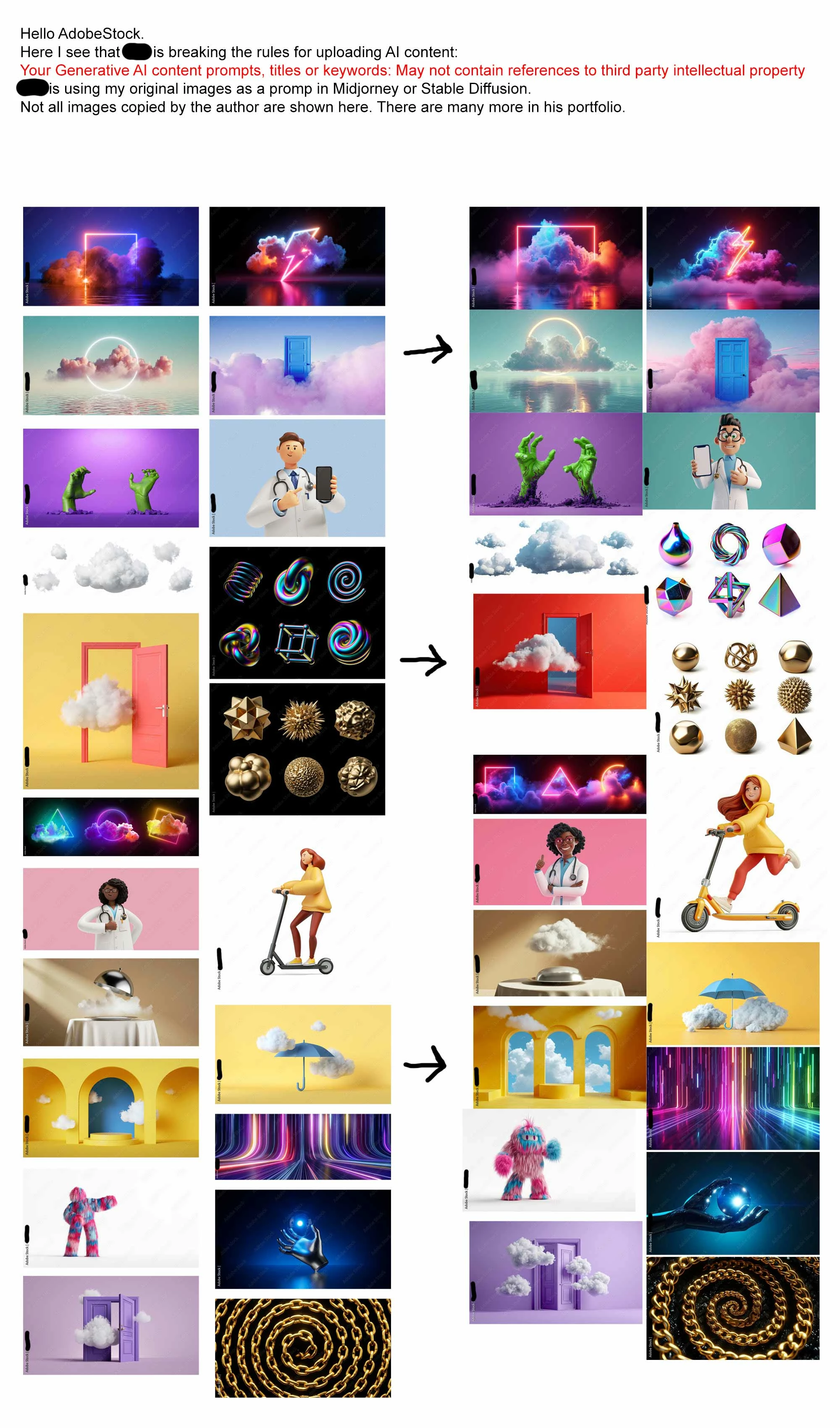 I found that one author (actually there are many), takes images from my portfolio, uses them as a prompt in Midjourney, Stable Diffusion or Adobe firefly (it can be any AI generator, where there is the possibility of img2img) and generates similar AI works, and then sells these images on Adobe Stock. Also he copies the description of my work. "n the attachment, you will find a picture with several examples.