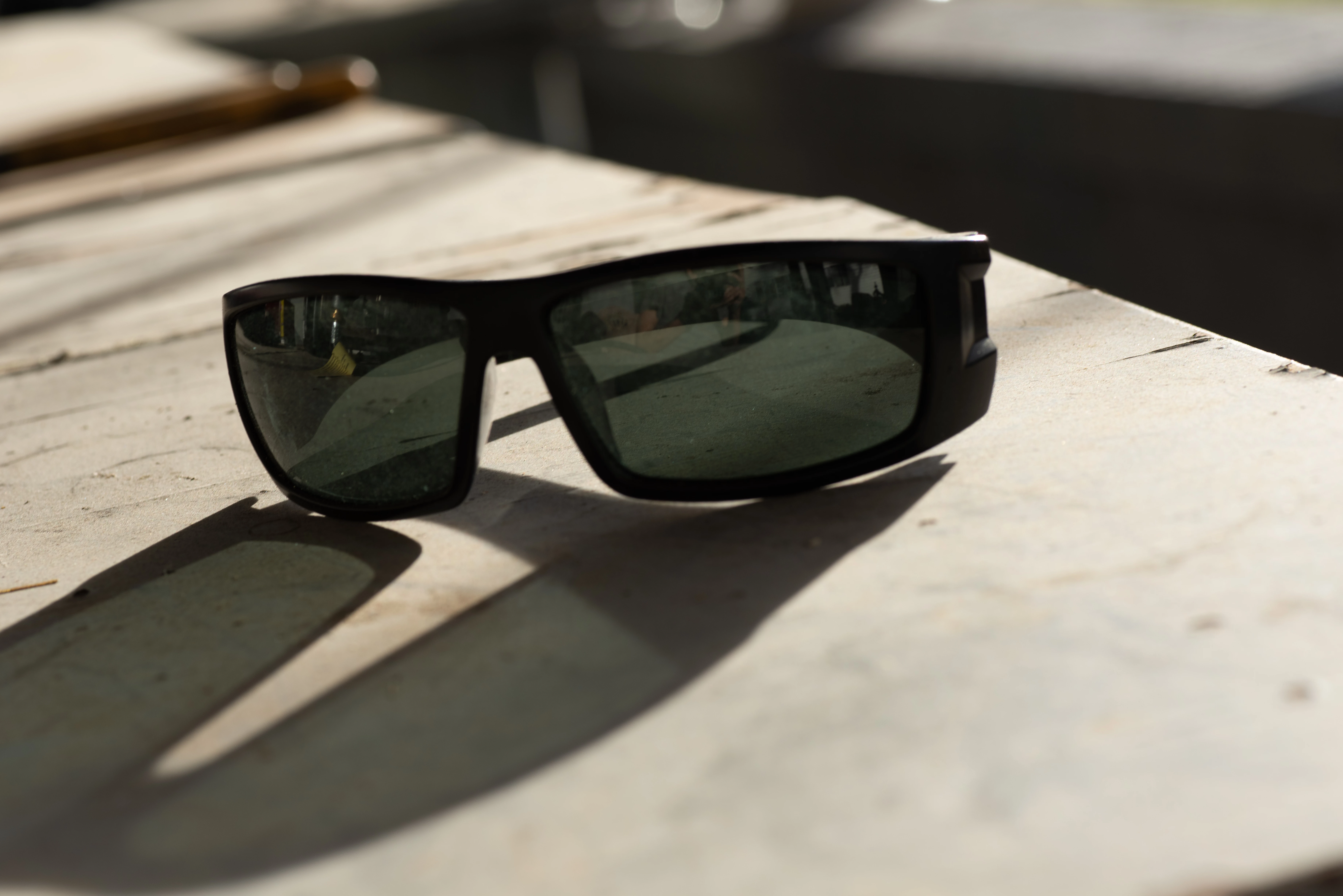 The sunglasses are underexposed and not sharp, and the colour is desaturated. There is a yellow stripe in the upper right corner, like a light leak.