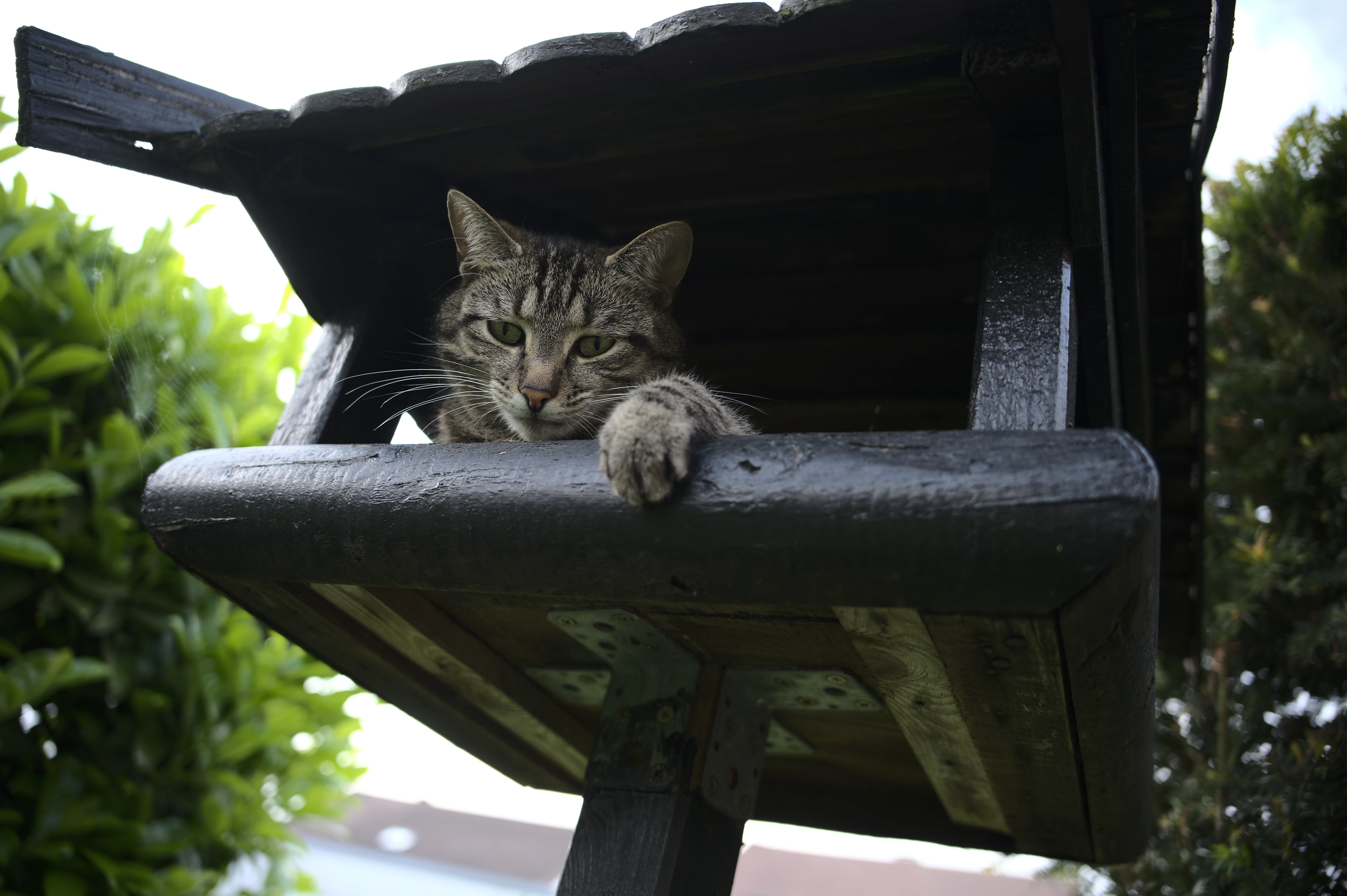 I like the composition of your image, but unfortunately the edges of the cat is not sharp. You did not have enough depth of field. Also the lower edge of the platform has green color fringing.