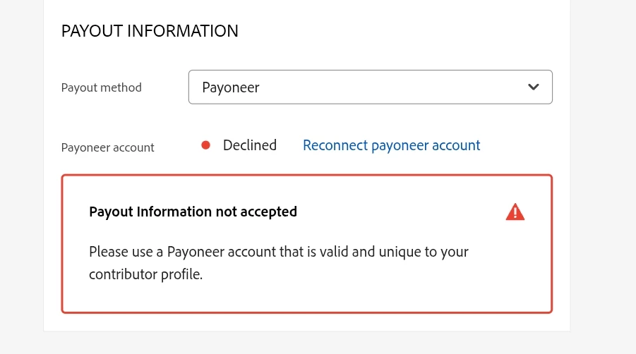 I am getting the this error anytime I try to link my Payoneer to Adobe stock contributer. Despite I receive a confirmation Email that my Payoneer has been successfully linked yet I see this error. I try to reconnect too many times but I get the same error.