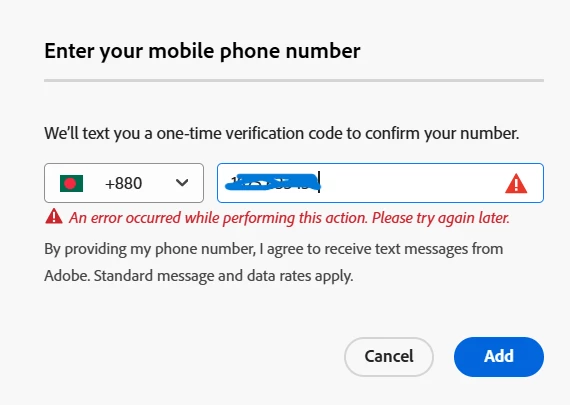 I’m Shamima from Bangladesh, and I’ve been trying for over 6 days to verify my phone number on my Adobe account ([Moderator deleted private information. Please do not post private information like e-mails and phone numbers]) to complete my registration as an Adobe Stock Contributor. Unfortunately, I keep getting the same error message: “An error occurred while performing this action.” I’ve followed every possible troubleshooting step on my end, including all the recommendations I received from AdobeCare via X (Twitter). Here’s everything I’ve tried so far:
