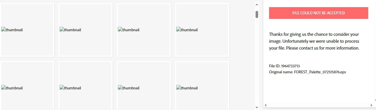 I am encountering a persistent issue while uploading my vector assets. After uploading, the files show a "thumbnail" placeholder and eventually return the error message: "FILE COULD NOT BE ACCEPTED - Thanks for giving us the chance to consider your image. Unfortunately we were unable to process your file."