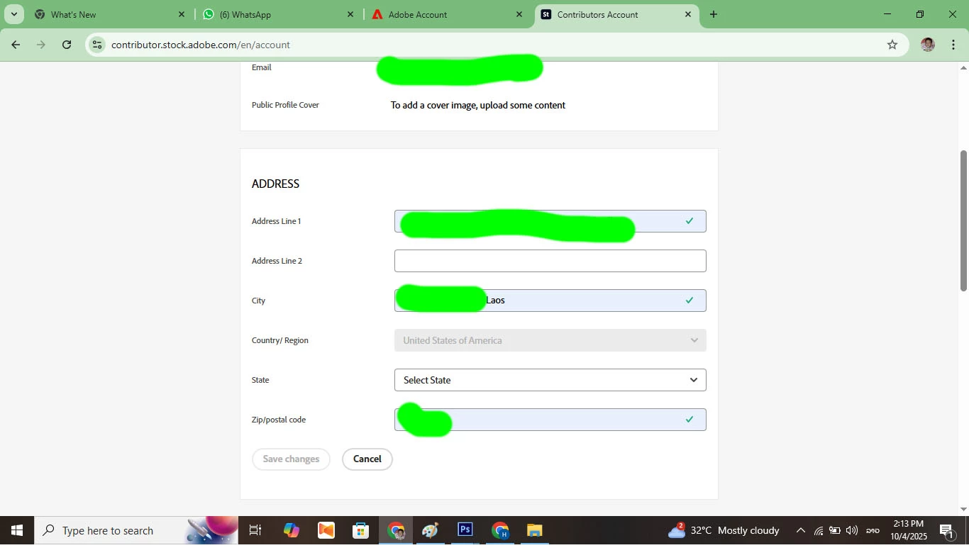 I have a serious technical issue on the Adobe Stock Contributor portal. In my Contributor Account, on the address form, the dropdown menu for "Country/Region" is broken. I cannot select my country, Laos. This prevents me from completing my profile and tax information.
