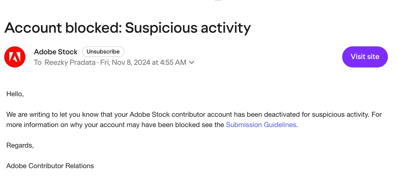 If any anomalies are detected in an account’s activity, Adobe should communicate directly with the contributor to clarify and resolve the issue, rather than taking immediate punitive actions like account suspension or banning.