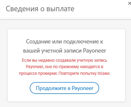 Вітаю, я знаю, що форум не для цієї теми, але можливо хтось мав таку проблему і підкажіть що робити, коли я намагаюсь вивести гроші через Payoneer, в мене виходить таке повідомлення: "Если вы недавно создавали учетную запись Payoneer, она по-прежнему находится в процессе проверки. Повторите попытку позже." Як довно потрібно чекати? Тому що Payoneer мені ще вчора відповів, що я прив'язала Adobe Canada Services Corporation к своему аккаунту Payoneer. Дякую за відповіді!