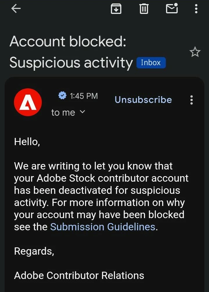 Could someone please clarify what “suspicious activity” means in the context of Adobe Stock contributor accounts? What types of actions or situations typically trigger this warning or lead to account deactivation?