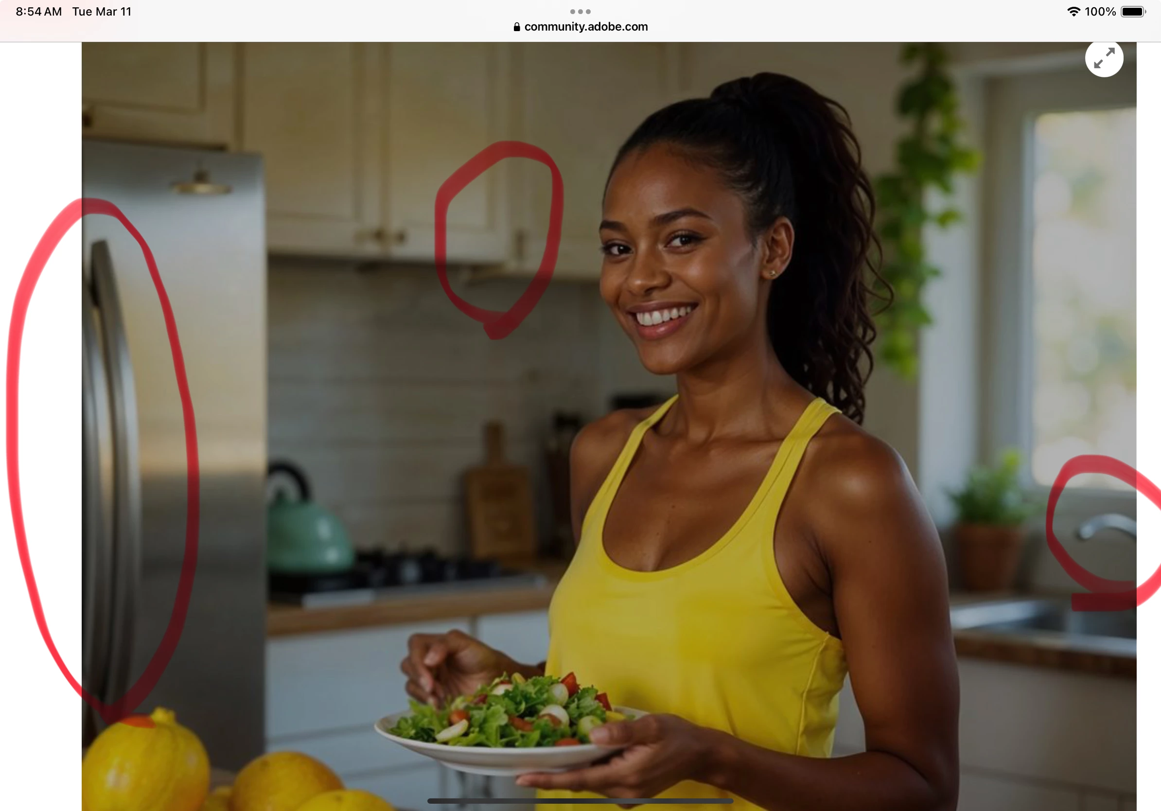AI drawing errors: the handles in the fridge aren't properly drawn, nor is the faucet. There's also an error in the cabinet.