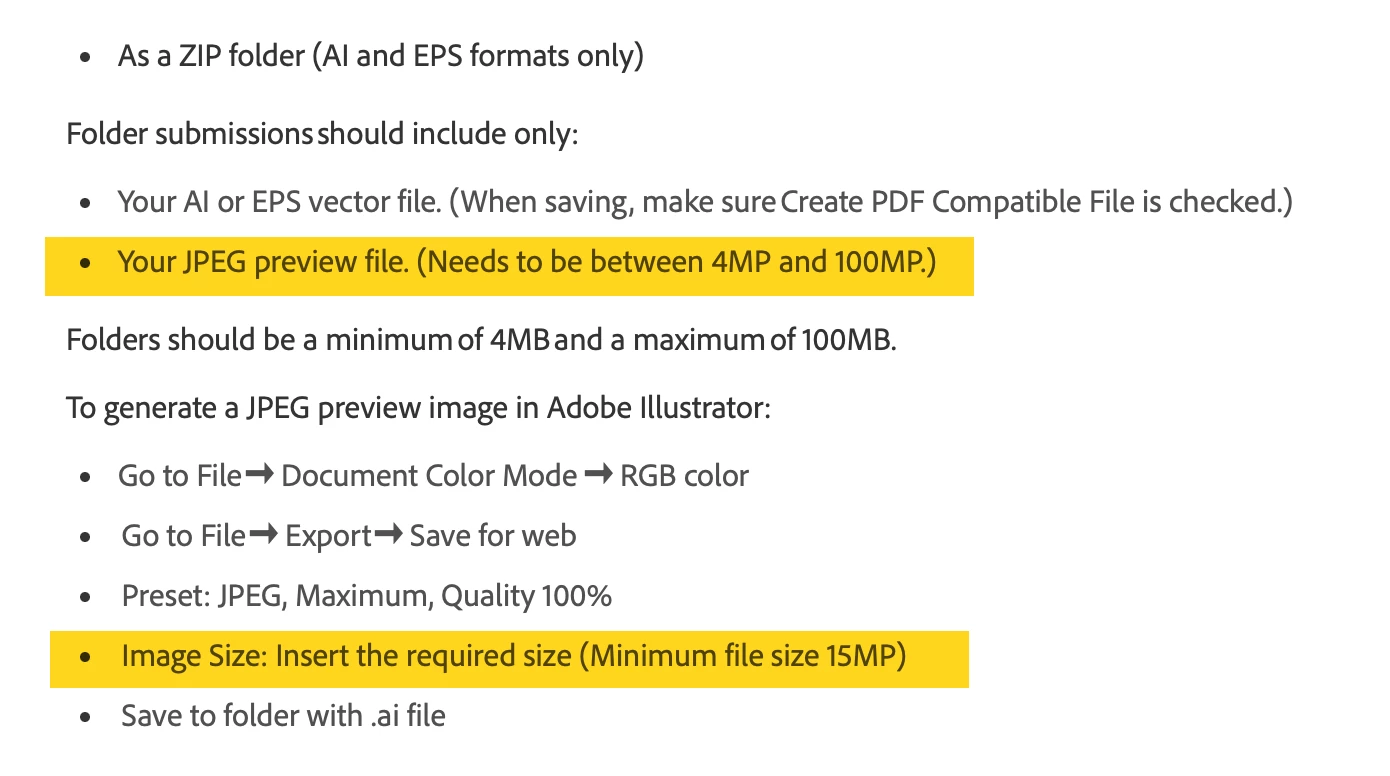 I am trying to upload my .ai vector files and of course as they are in the CMYK space they look worng so I am doing the Jpeg previews. HOWEVER I am confused as to what size the previews need to be. The submission guidelines give confliceting advice as far as I can tell. I attach a screengrab. Sow which is it? Between 4MP -100MP or MIMIMUM 1MP? Help greatly appreciated - I can't find anything on this forum to answer this yet? Jacqui