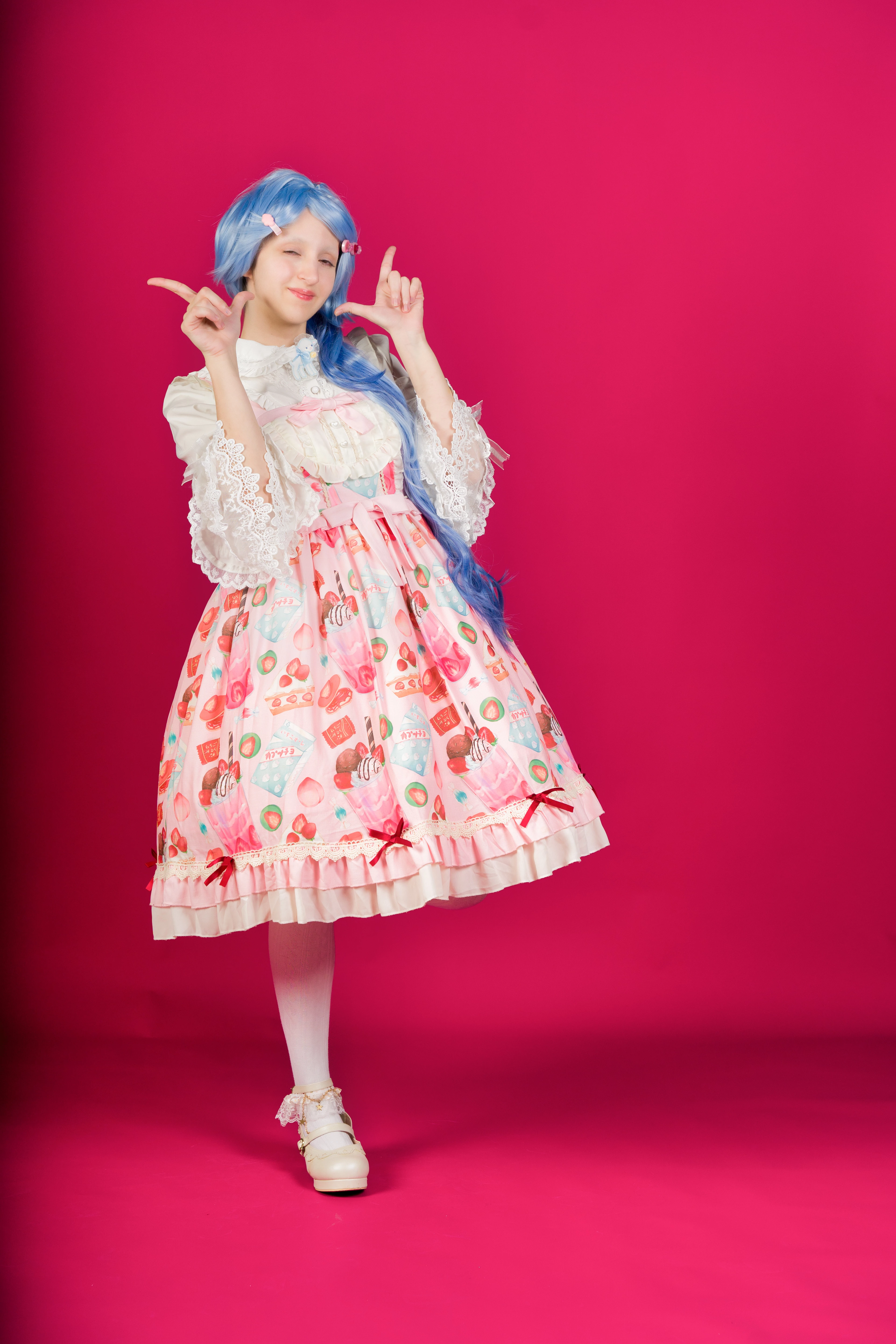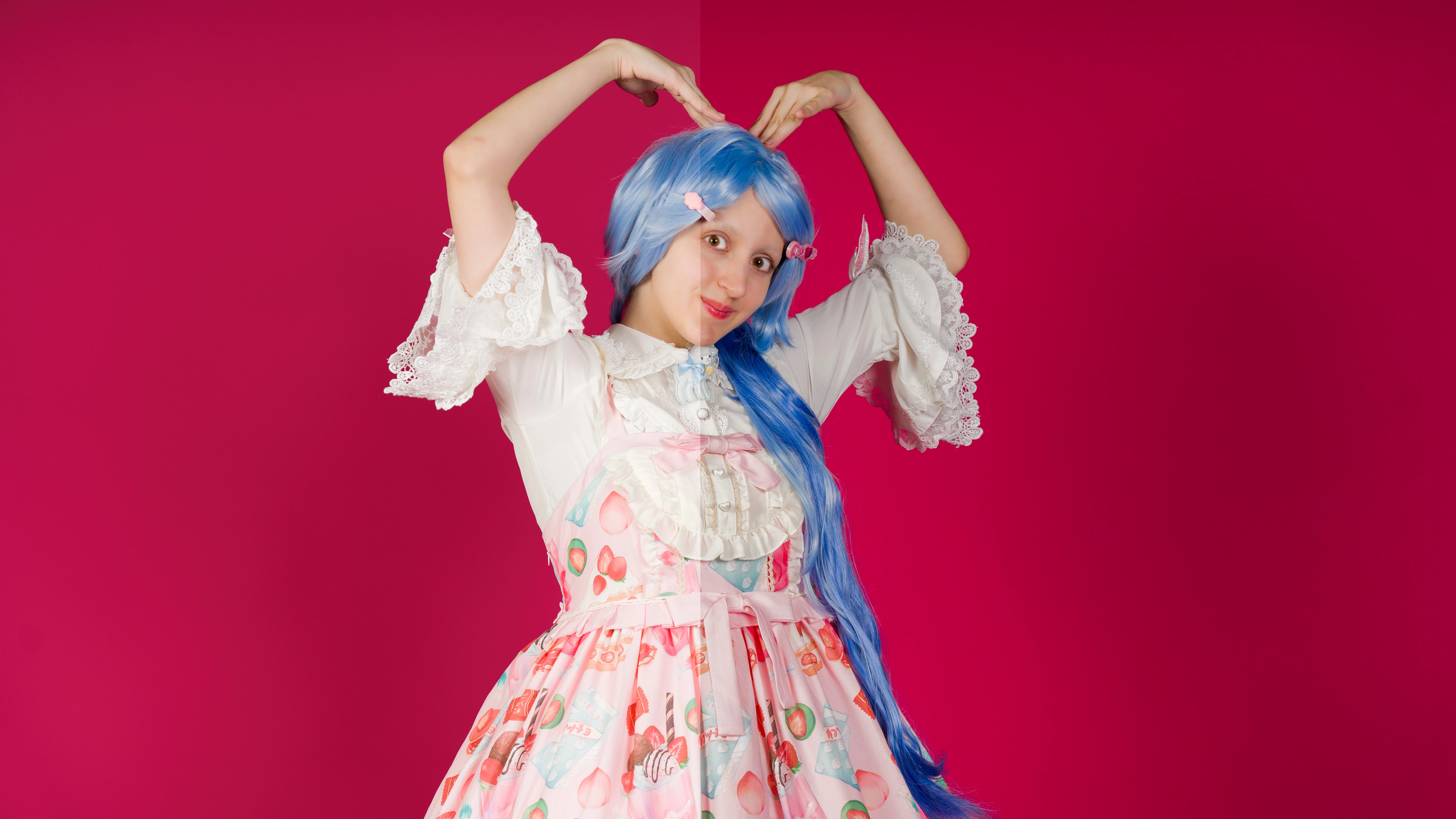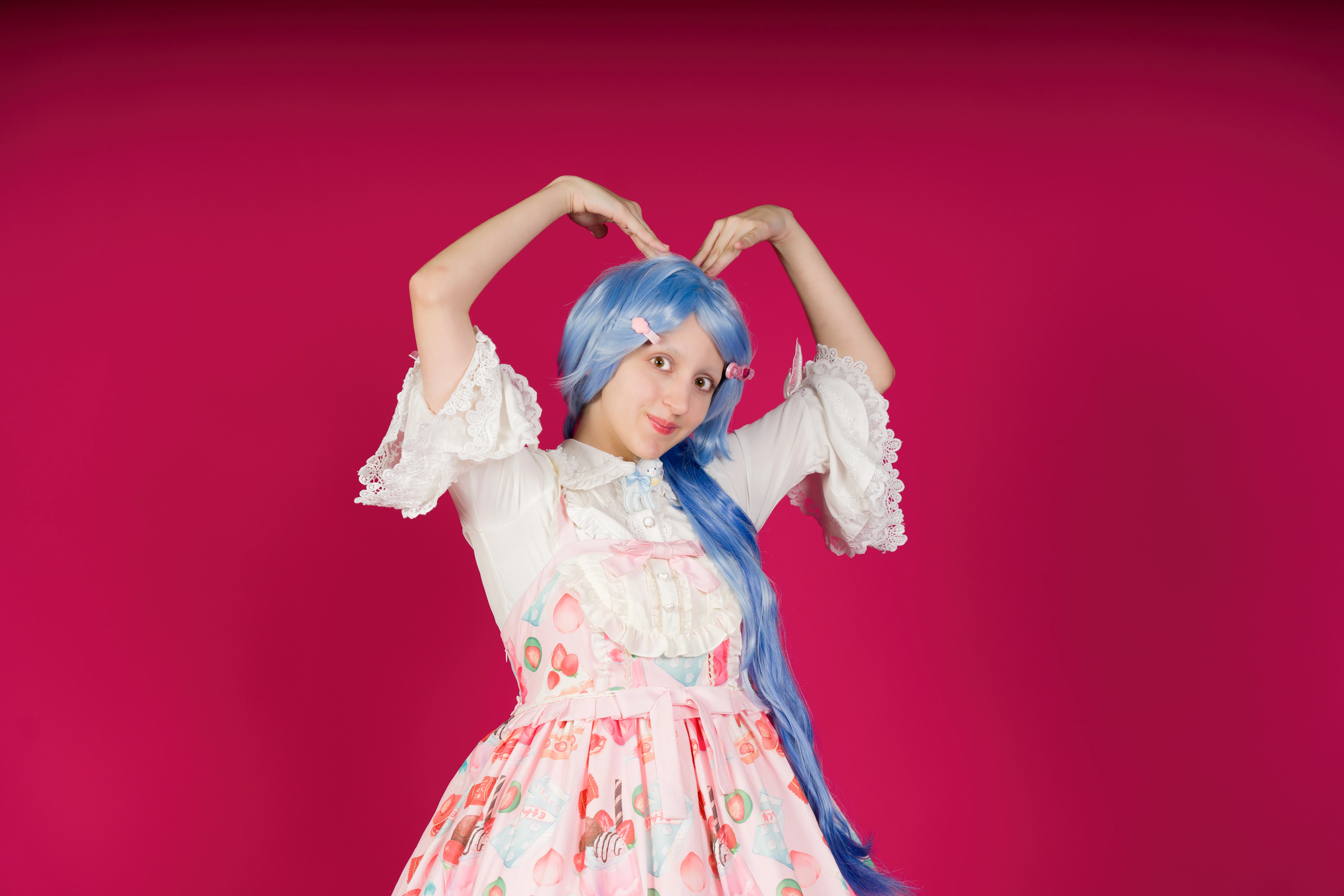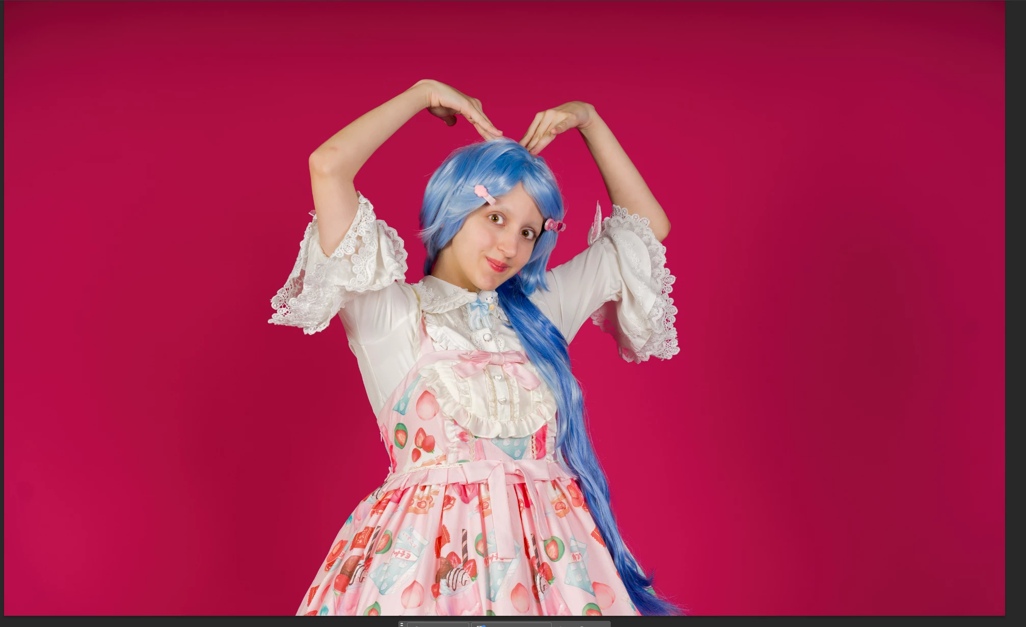 The red background, even that it contrasts with the blue hair, is disturbing. it would be better to use a more neutral background. The red will cause issues, if someone wants to cutout the model for their use. If you need a neutral background, you can't use this picture.
