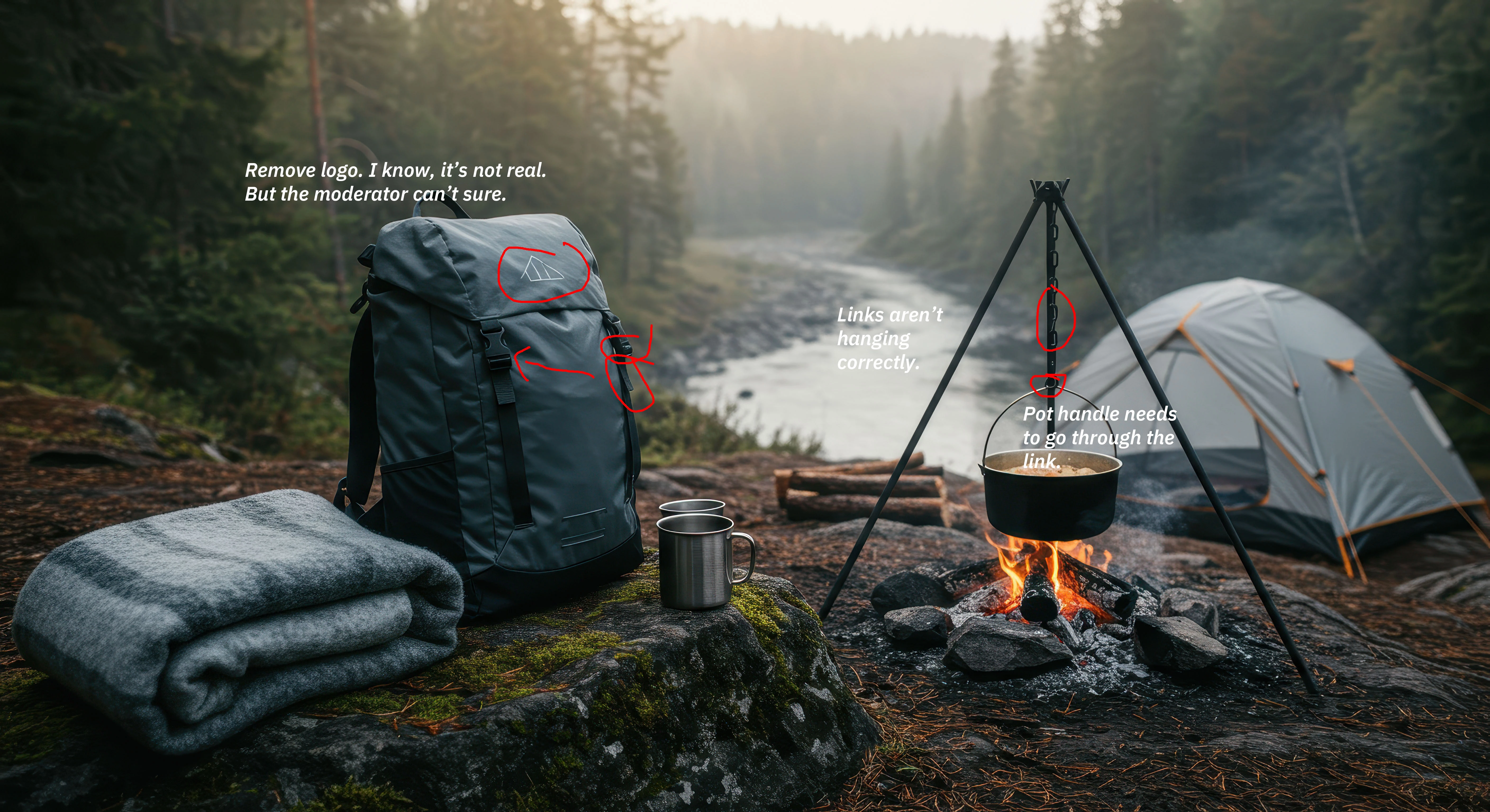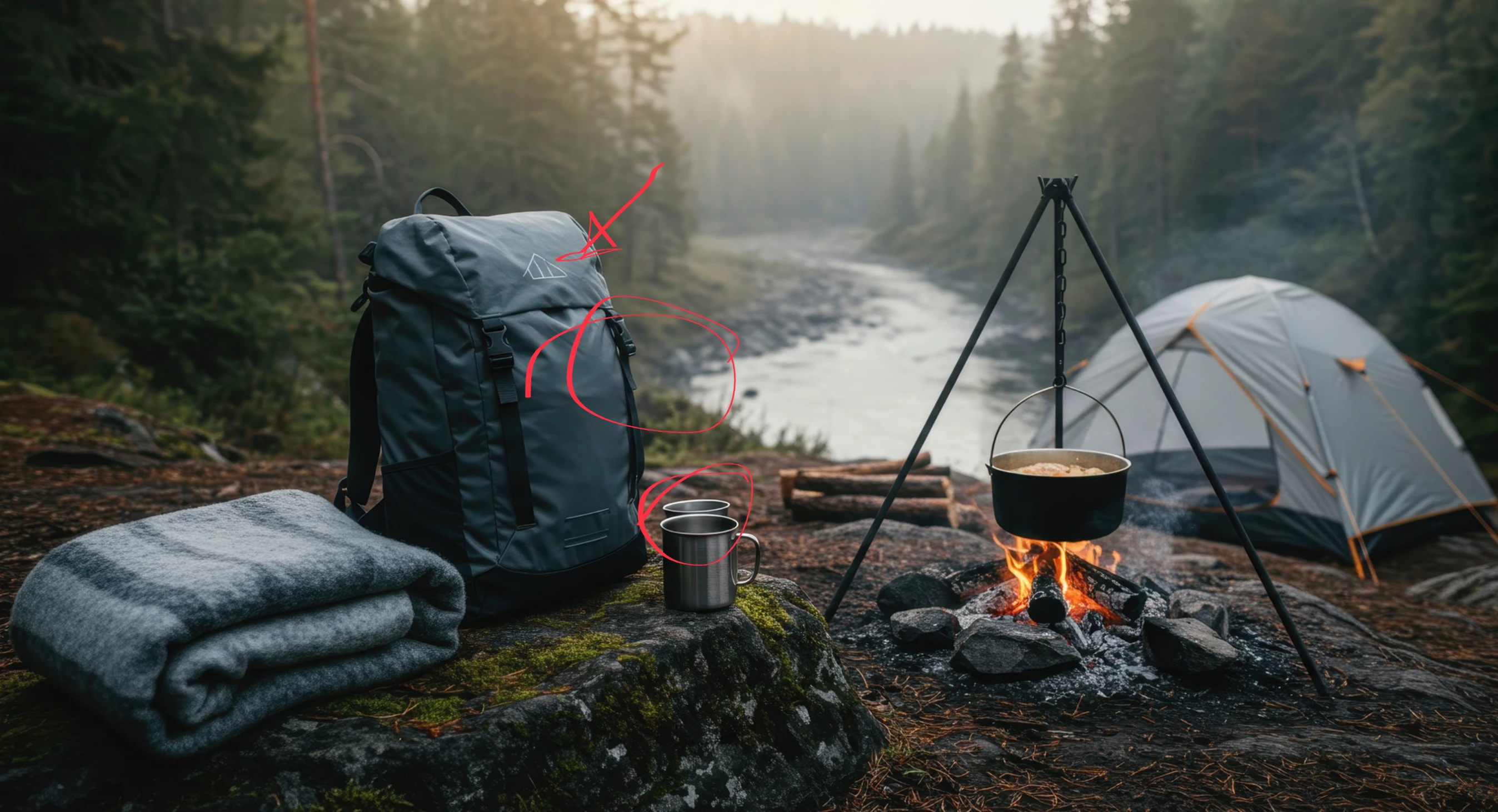 Conceptual errors: tent placement, firewood, cooking tripod (you won't take such a tripod with you), you do not take wool covers on a trekking tour, etc.