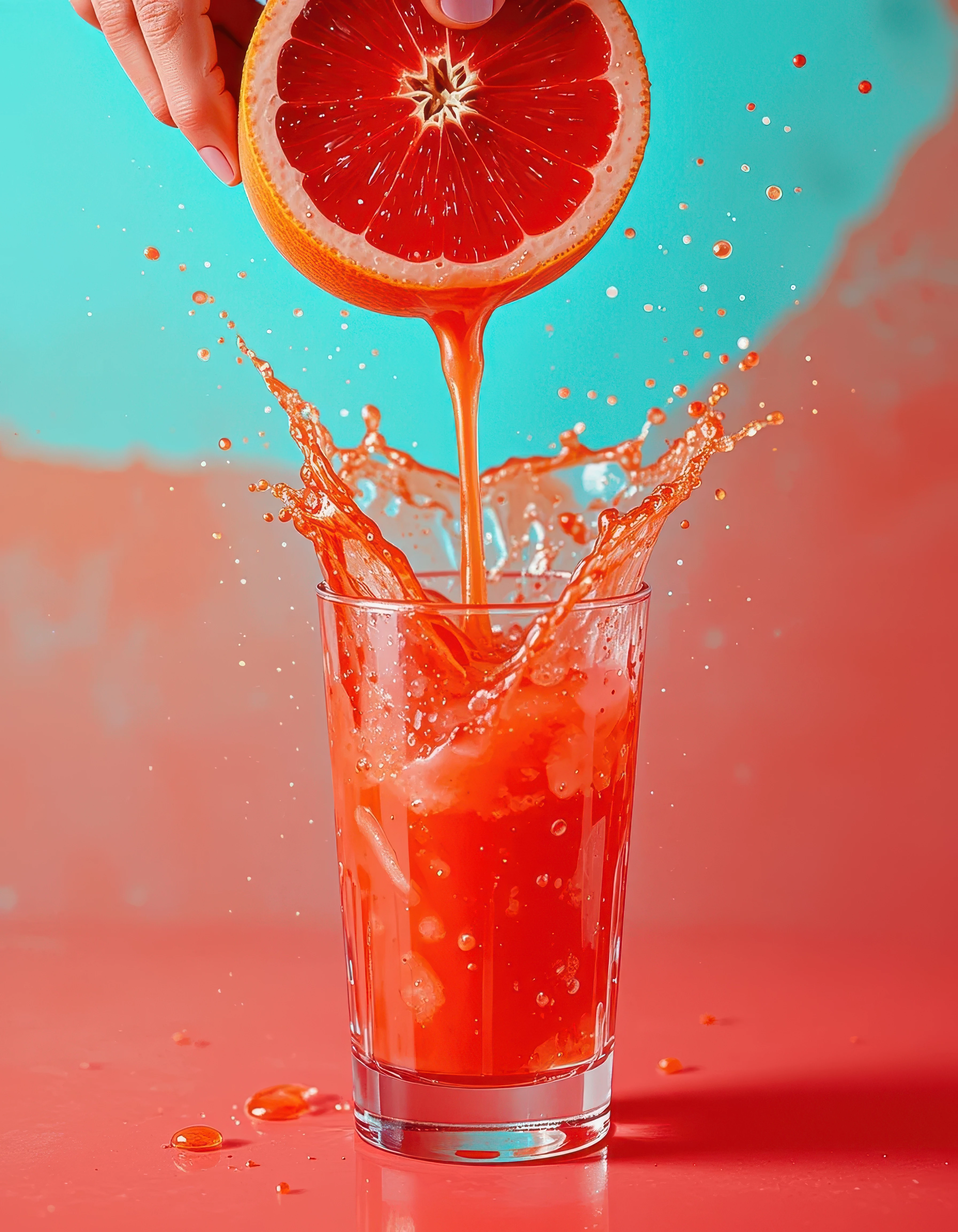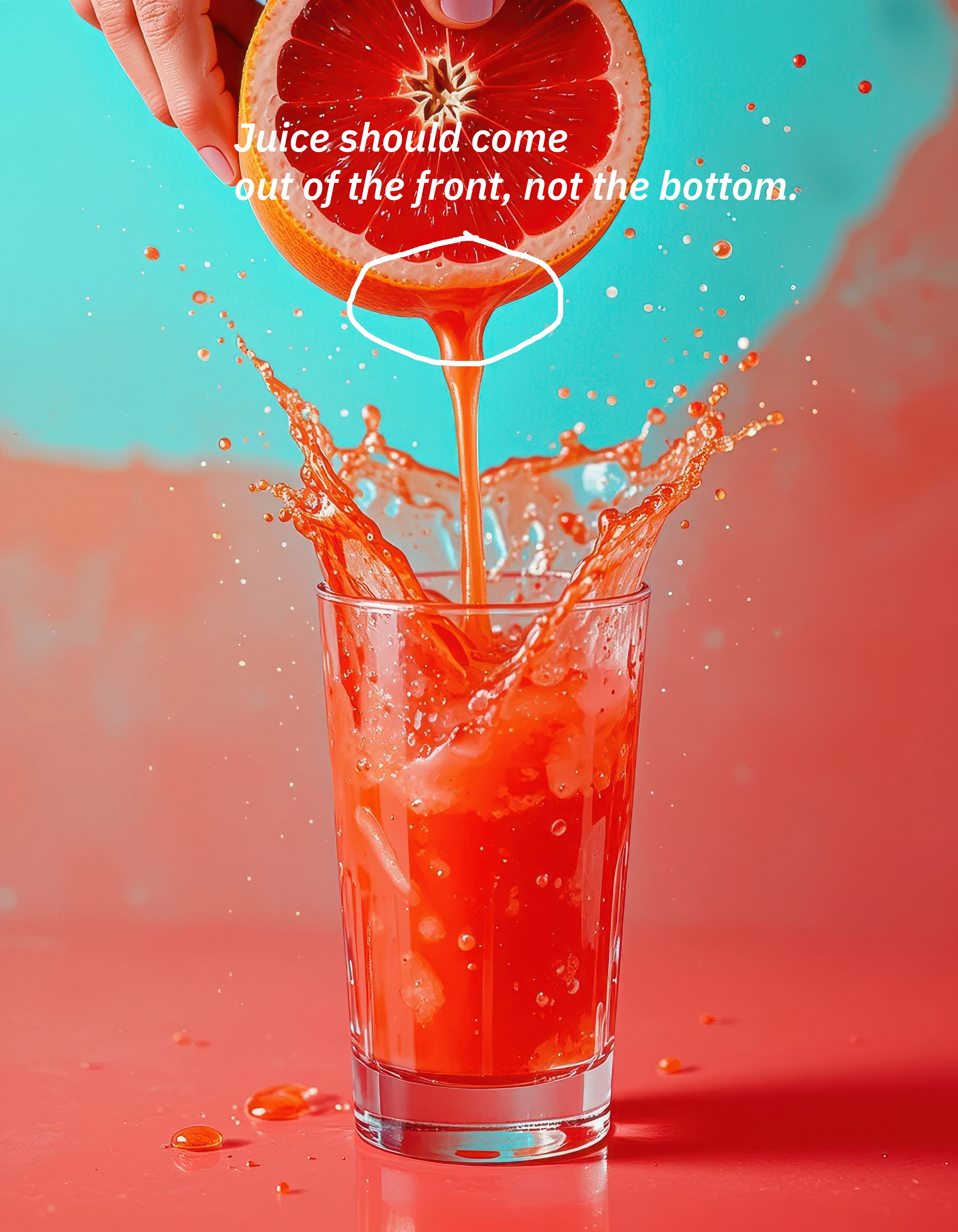 Your second is conceptually unrealistic, besides the rendering errors. You do not hold an orange like that to squeeze it, your fingers have texture errors, there is an outline between the hand and the background. To get a flow that makes the fluid swap over like this, you would need to use a different system. In any case, the juice rinsal is not enough.. And getting this flow coming out of an unsqueezed orange is unrealistic too.