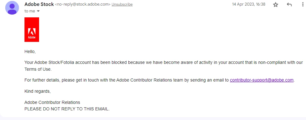 I am writing this post to seek your help with a concerning issue I am facing. My Adobe Stock/Fotolia account has been blocked without any apparent reason. I received an email stating that your account has been blocked because we have become aware of activity in your account that is non-compliant with our Terms of Use. It has been almost 15 days since my account was blocked, and I have sent multiple emails to the Adobe Contributor Relations team to seek clarification on the reason behind it. Unfortunately, despite my efforts, I have not received a response to any of my emails. This lack of communication from their end has added to my frustration and confusion regarding the situation. I would like to emphasize that I have not engaged in any illegal activity on my account and have 1st pending payouts of around $250.
