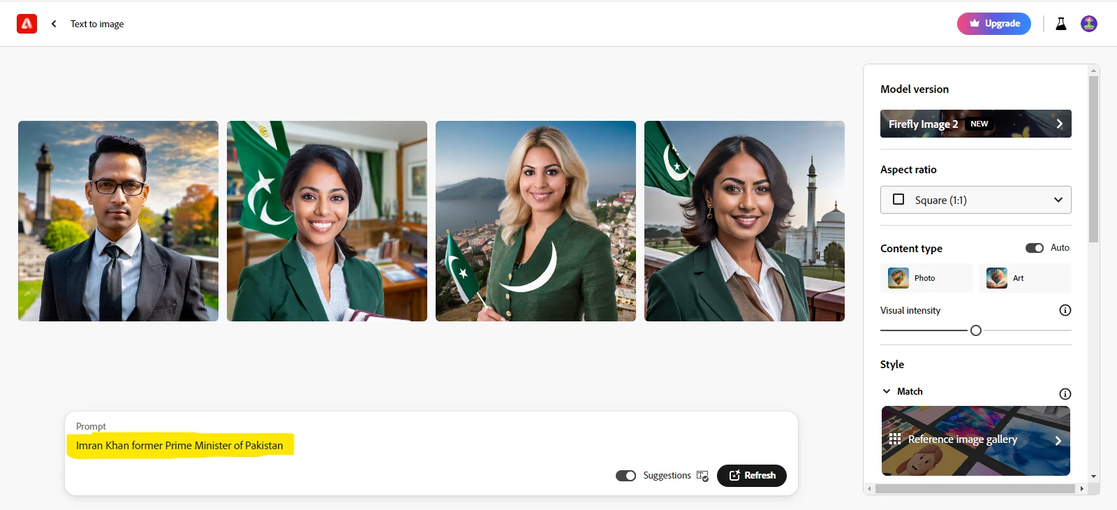 Adobe Firefly is not aware who is "Imran Khan" the former Prime Minister of Pakistan.
