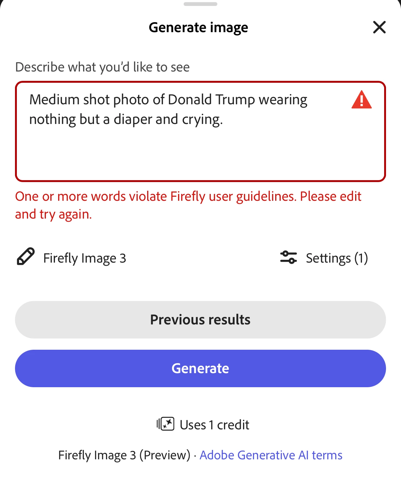 This was the last straw for me. I'm done. Firefly is terrible, and it seems like Adobe is in the tank for the Trump Administration, not wanting to upset Dear Leader.