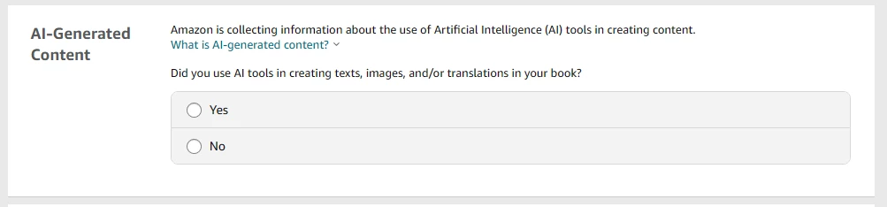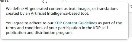 We require you to inform us of AI-generated content (text, images, or translations) when you publish a new book or make edits to and republish an existing book through KDP. AI-generated images include cover and interior images and artwork. You are not required to disclose AI-assisted content. We distinguish between AI-generated and AI-assisted content as follows: