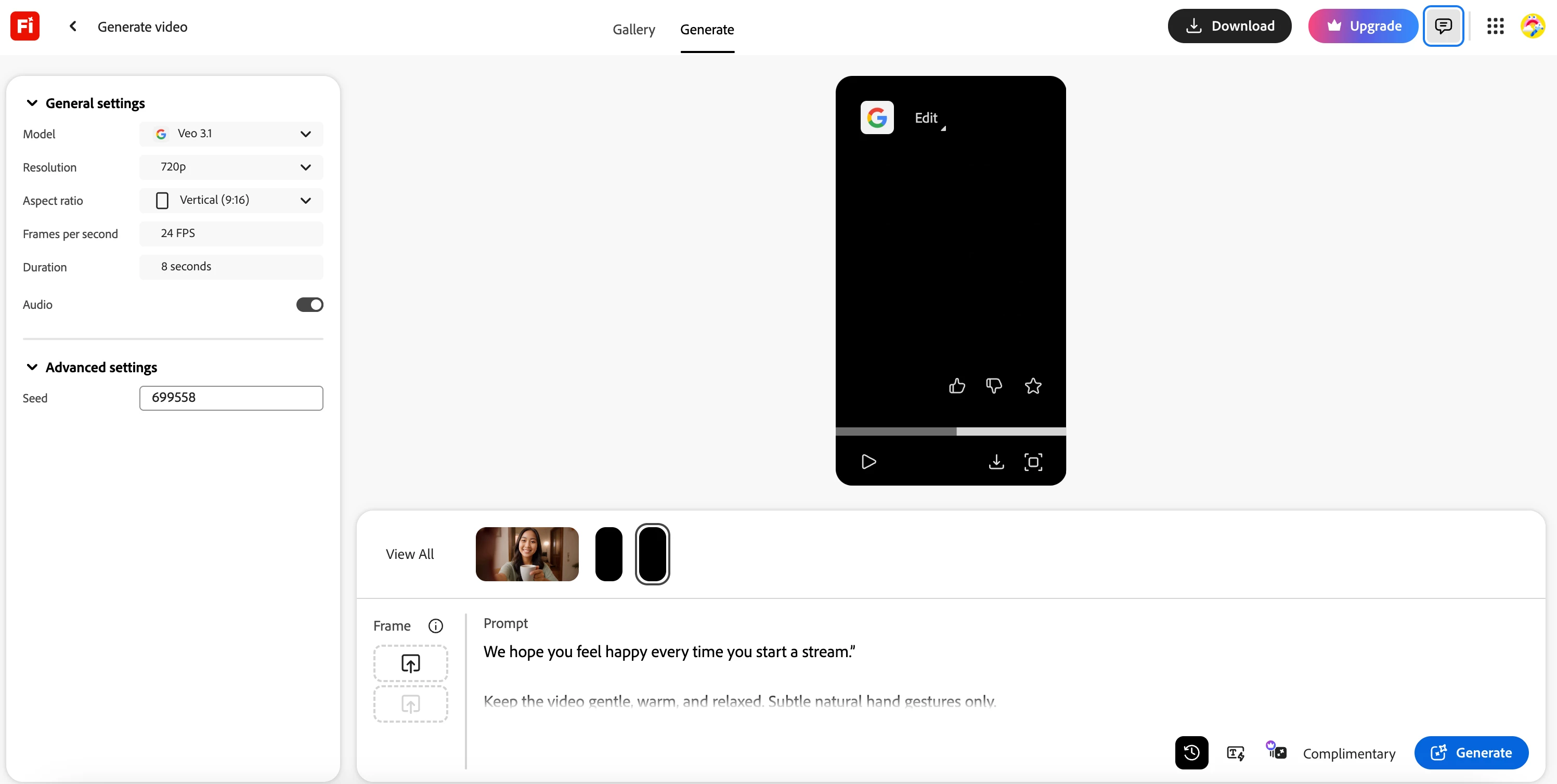 I was testing with Adobe's AI video generate before I commit to my subscription. However, all of my videos were incorrectly made, including two of them went fully black screen (no images and no sound), and one of them was cut off in the middle (did not follow the full prompt). I would still like to make sure that the videos can be generated without issues like them before I commit since I will be paying for the subscription. And, I would like to get my 3 video credit back to try again since I couldn't use any of them that were made with bug. Please see attached screenshot to show (you can also checked the videos I generated directly via the attachments). Thanks.